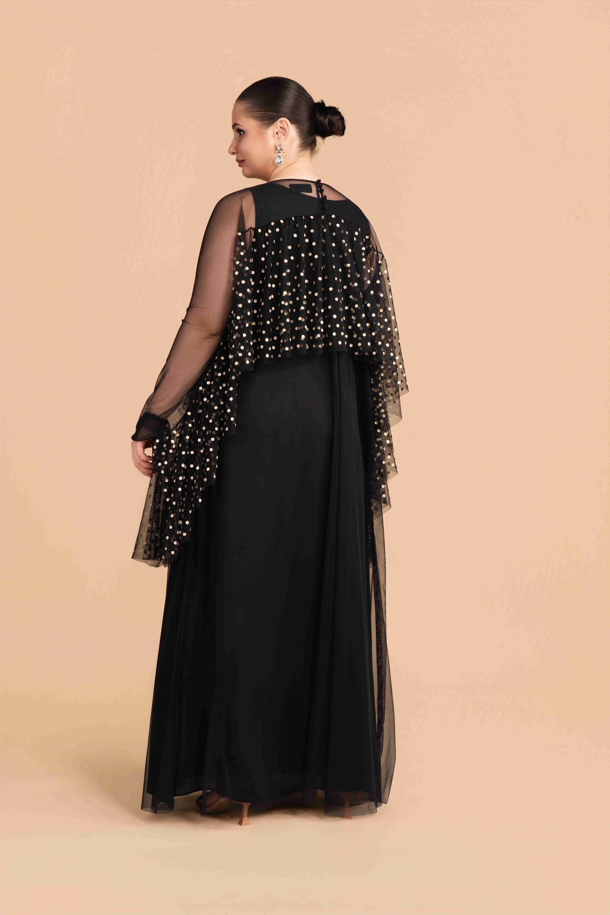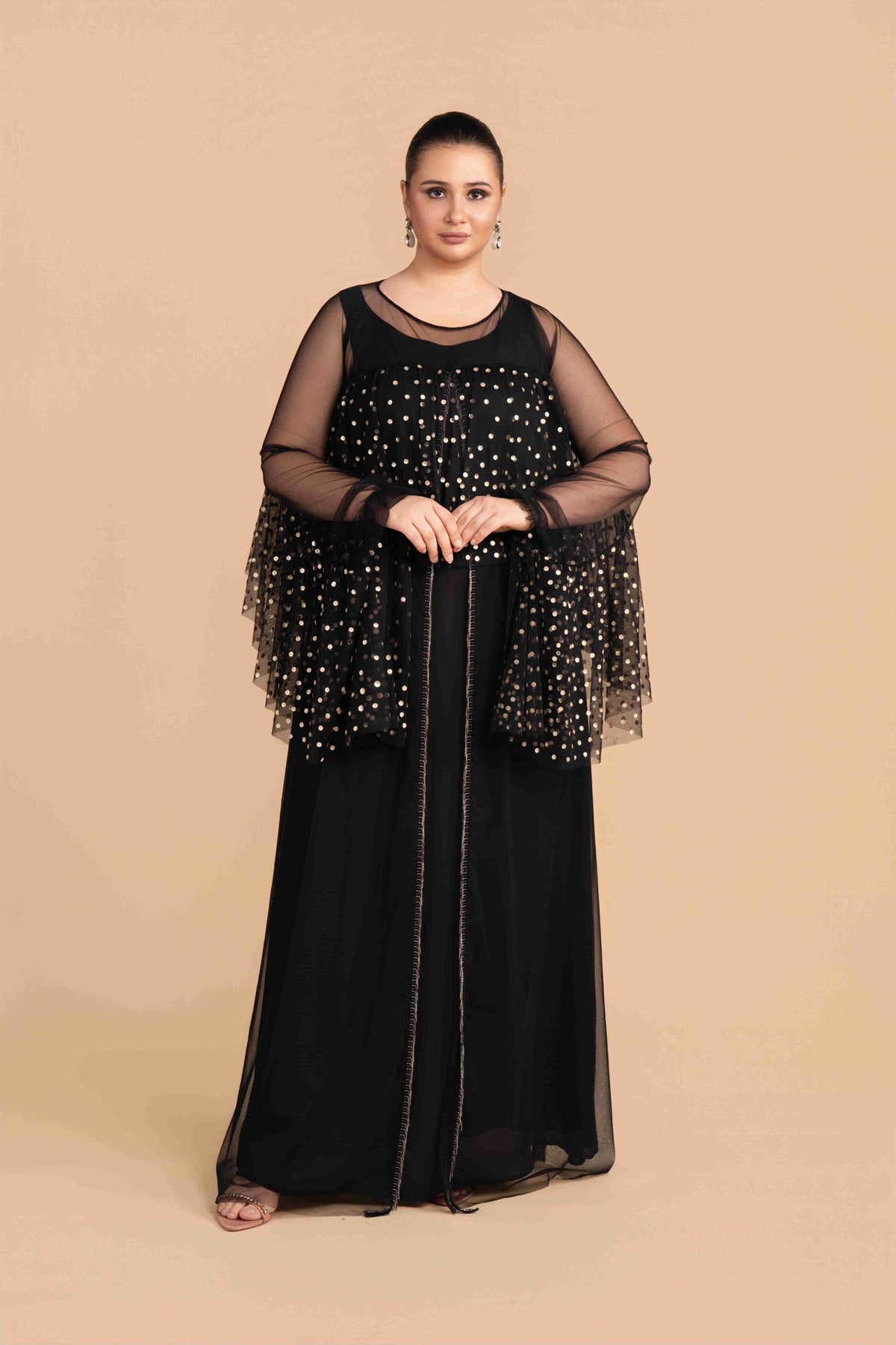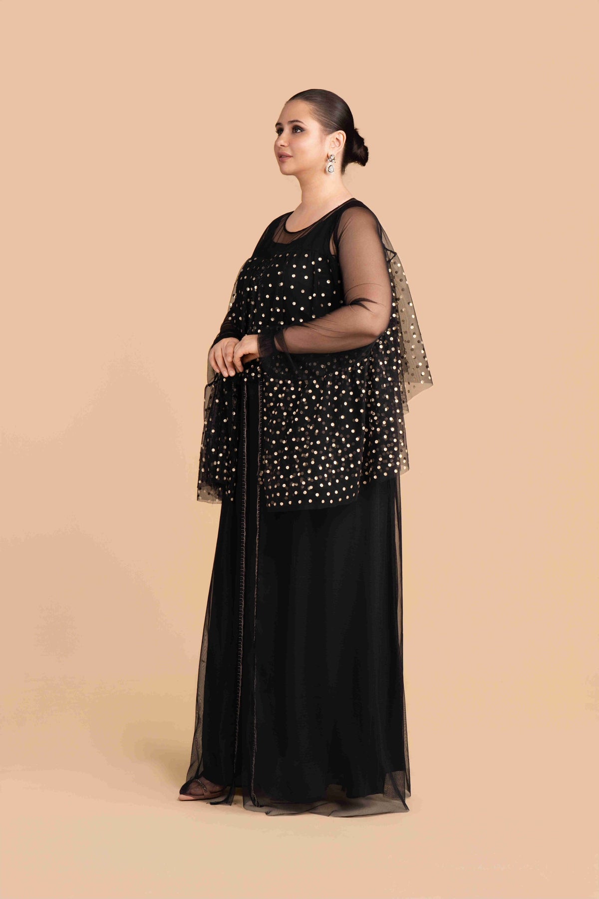 Opulent black velvet cape with silver zari and beadwork. crafted for festive nights.