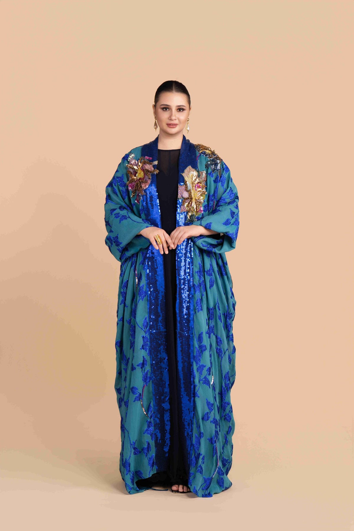 A dramatic midnight cape dress adorned with shimmering sequins. the silhouette flows gracefully, making it a bold choice for evenings and festive events.