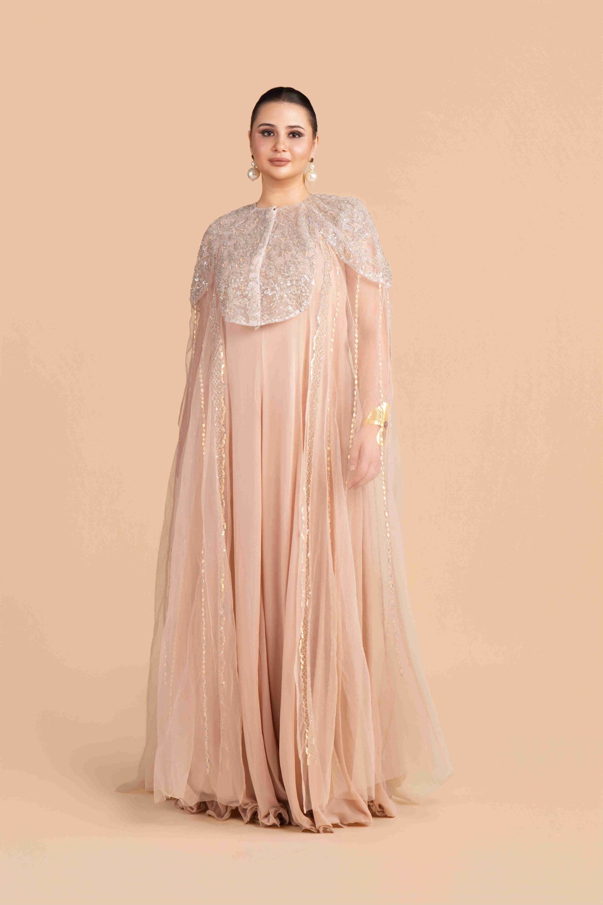 A blend of peach paired with gold hand- embroidery makes this cape subtle creating an uplifting festive mood.