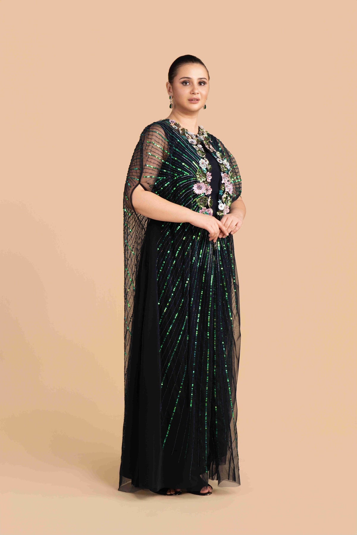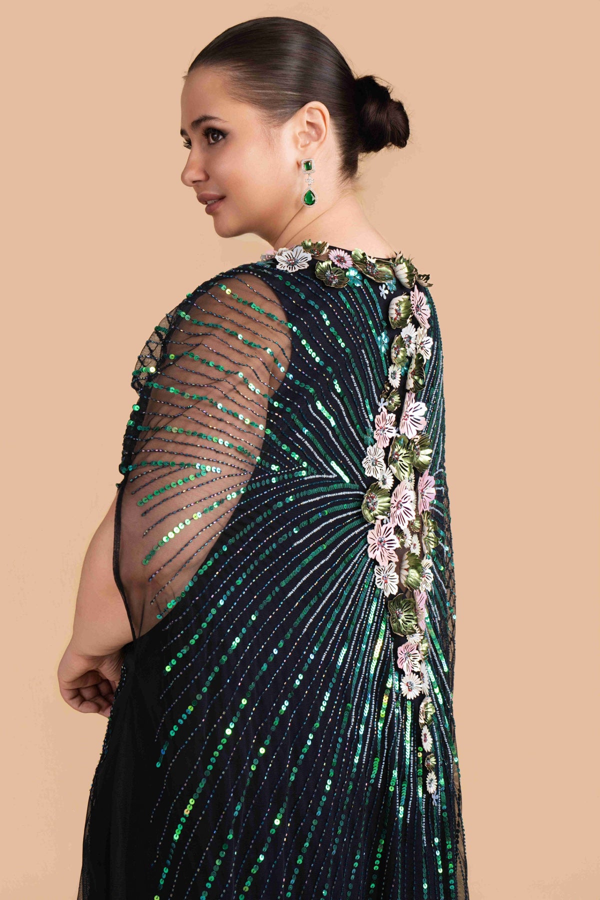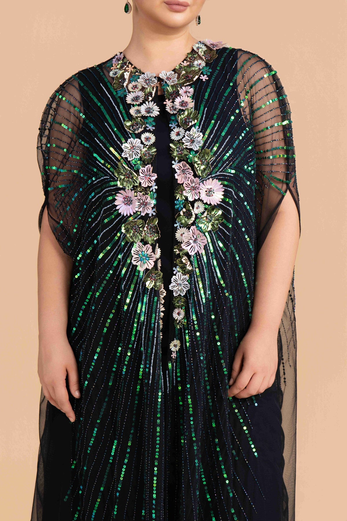 A dramatic black cape illuminated with hand-applied sequins and cutdana work.
