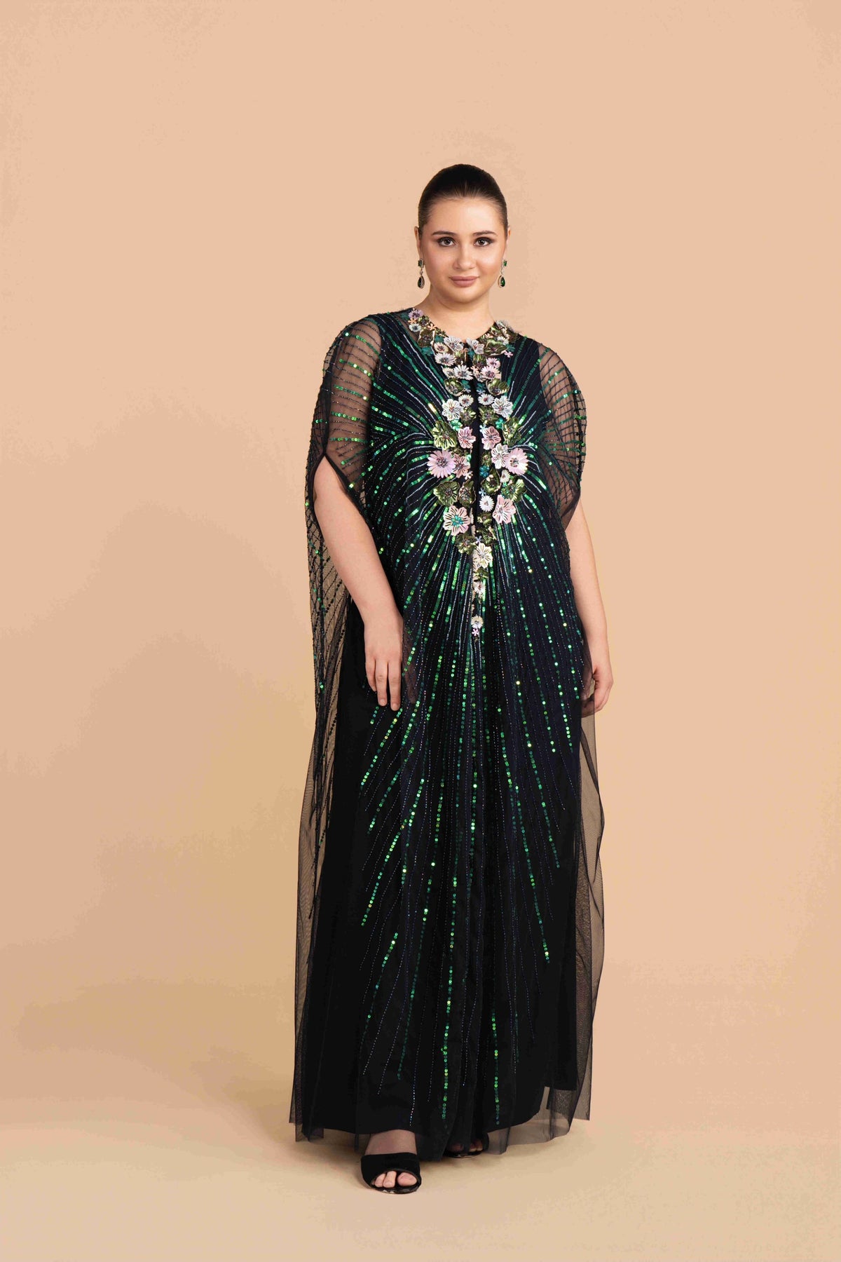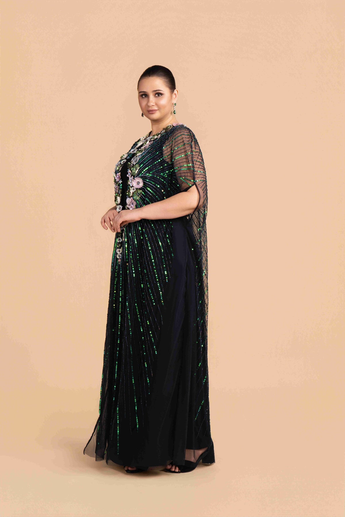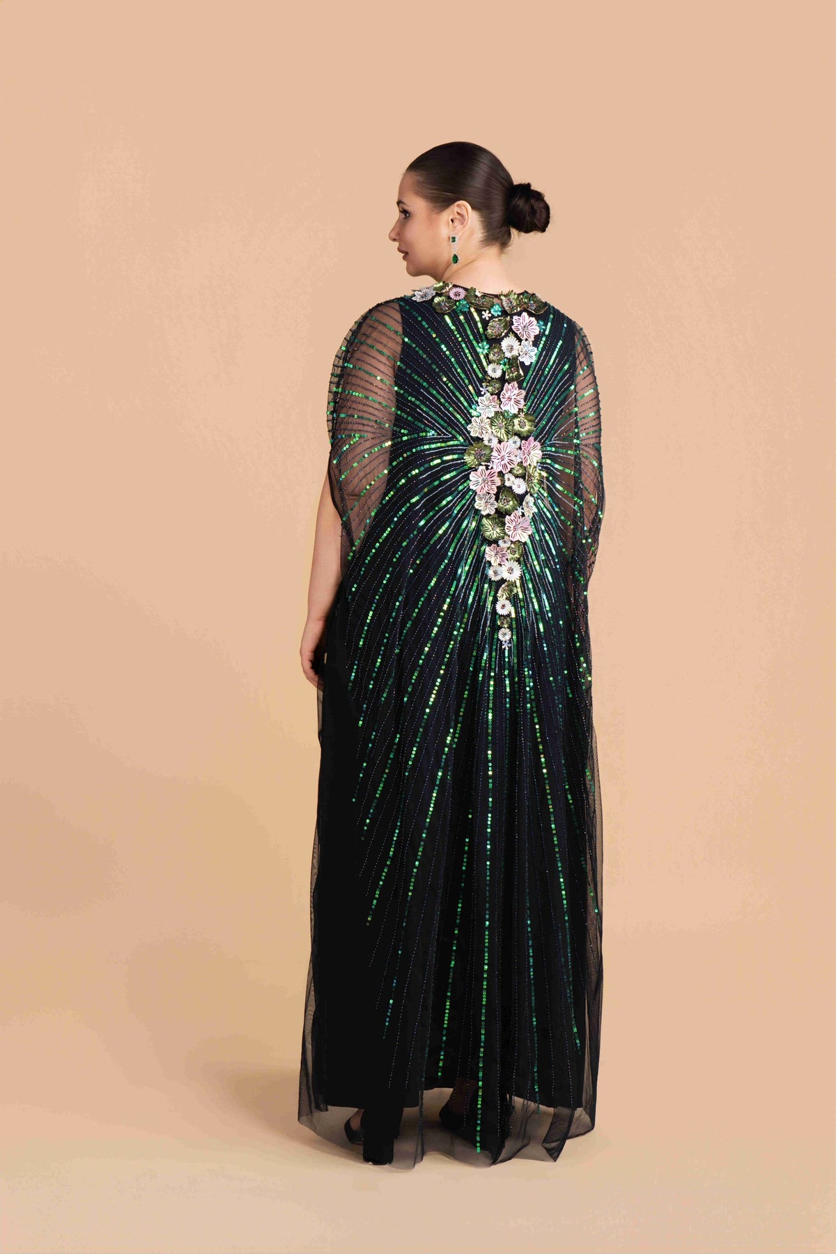 A dramatic black cape illuminated with hand-applied sequins and cutdana work.