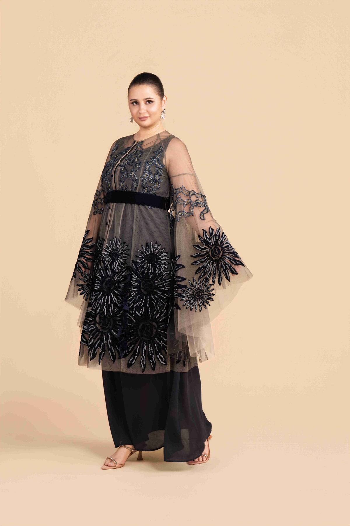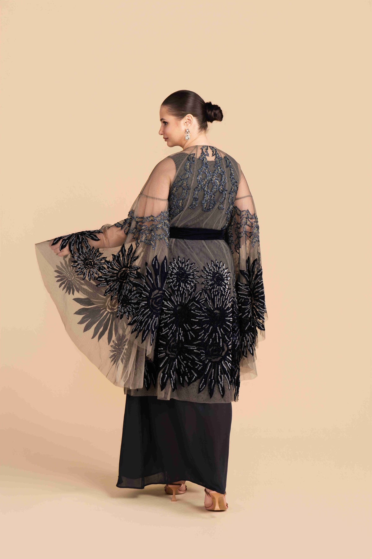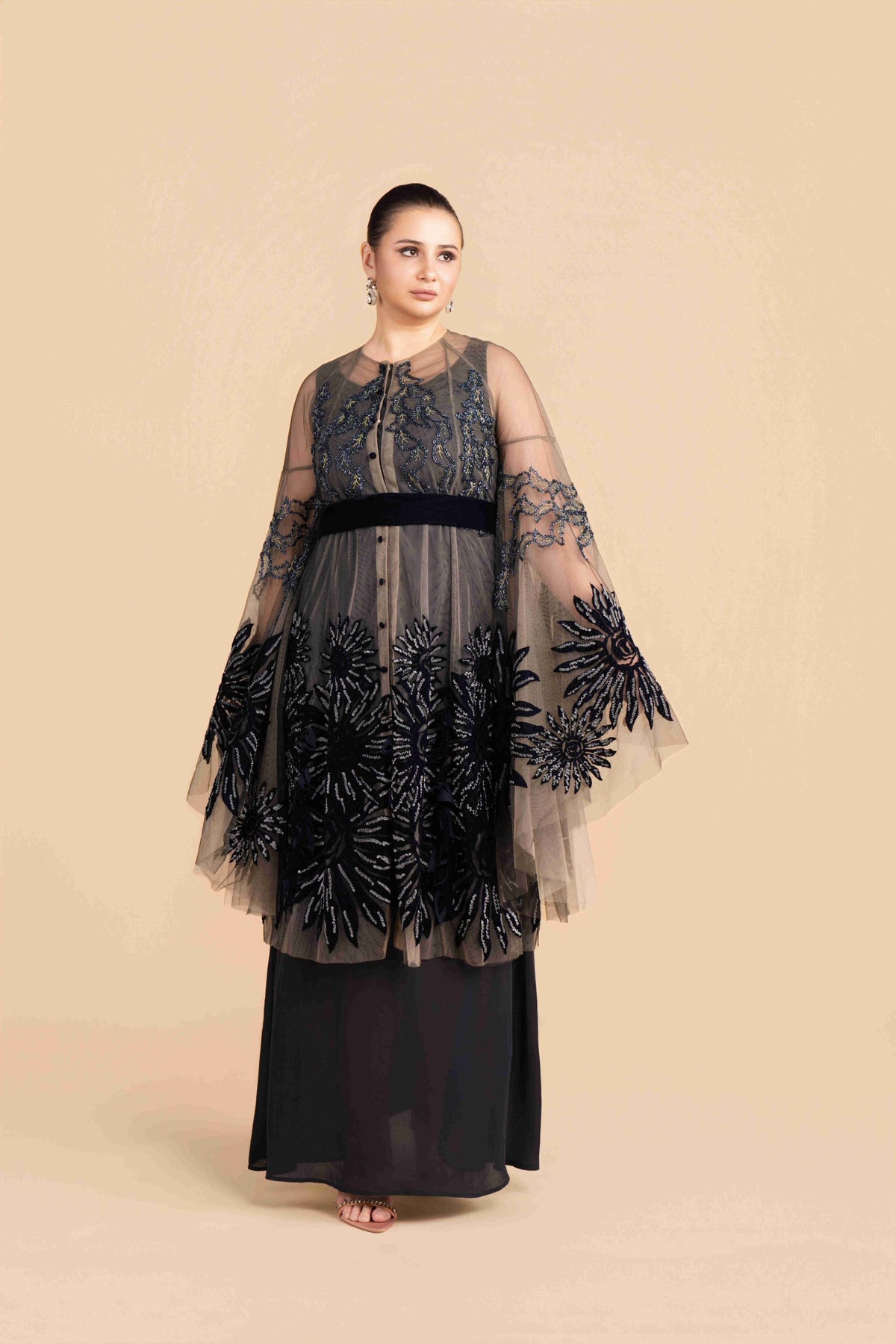 This dramatic layered cape pairs a sheer overlay with bold black threadwork and sequins, forming striking floral motifs across the sleeves and hem.