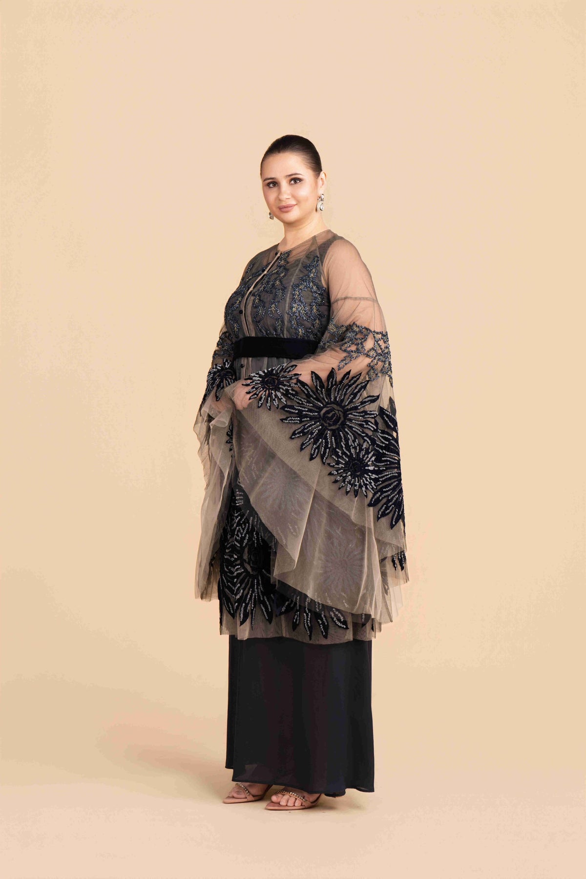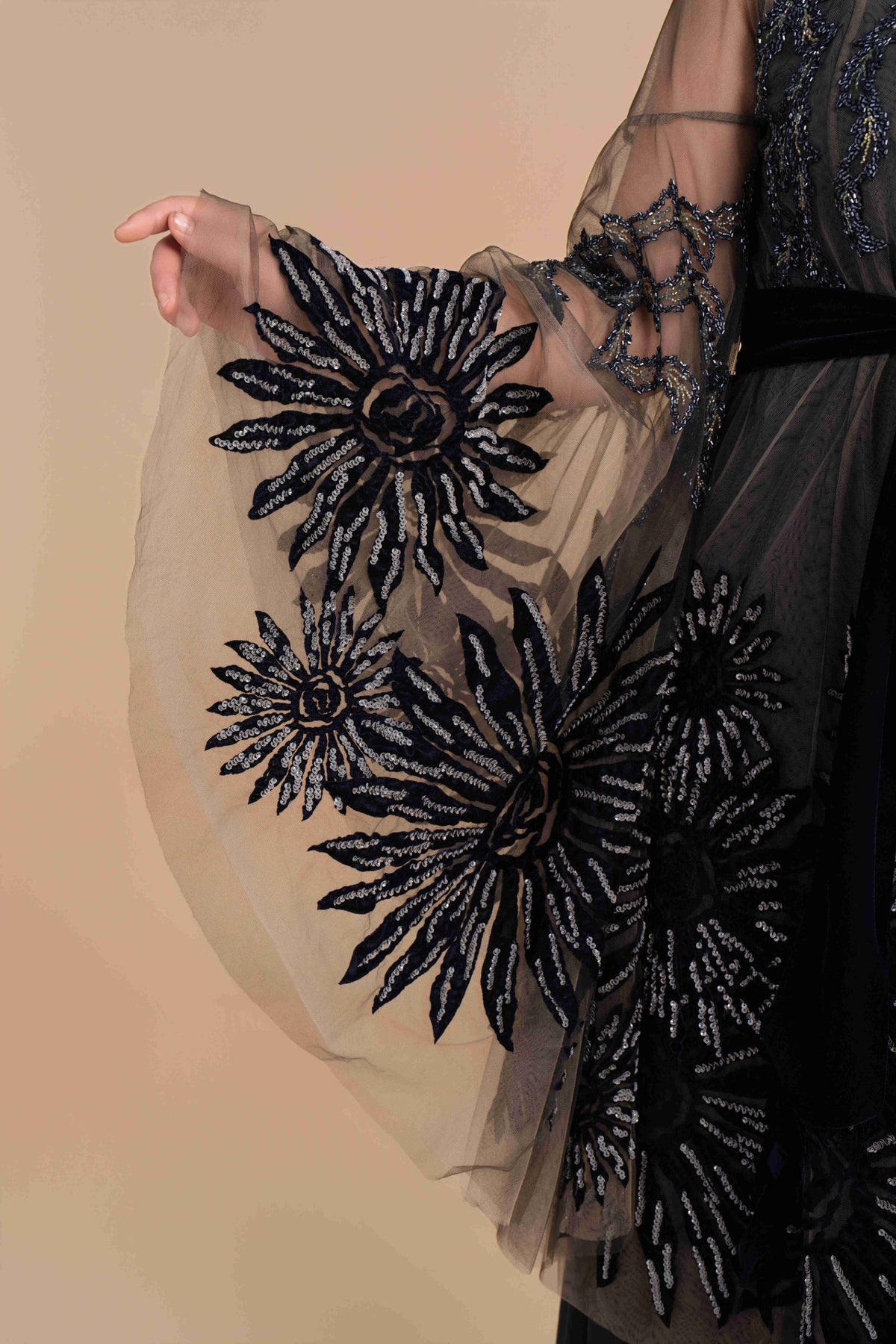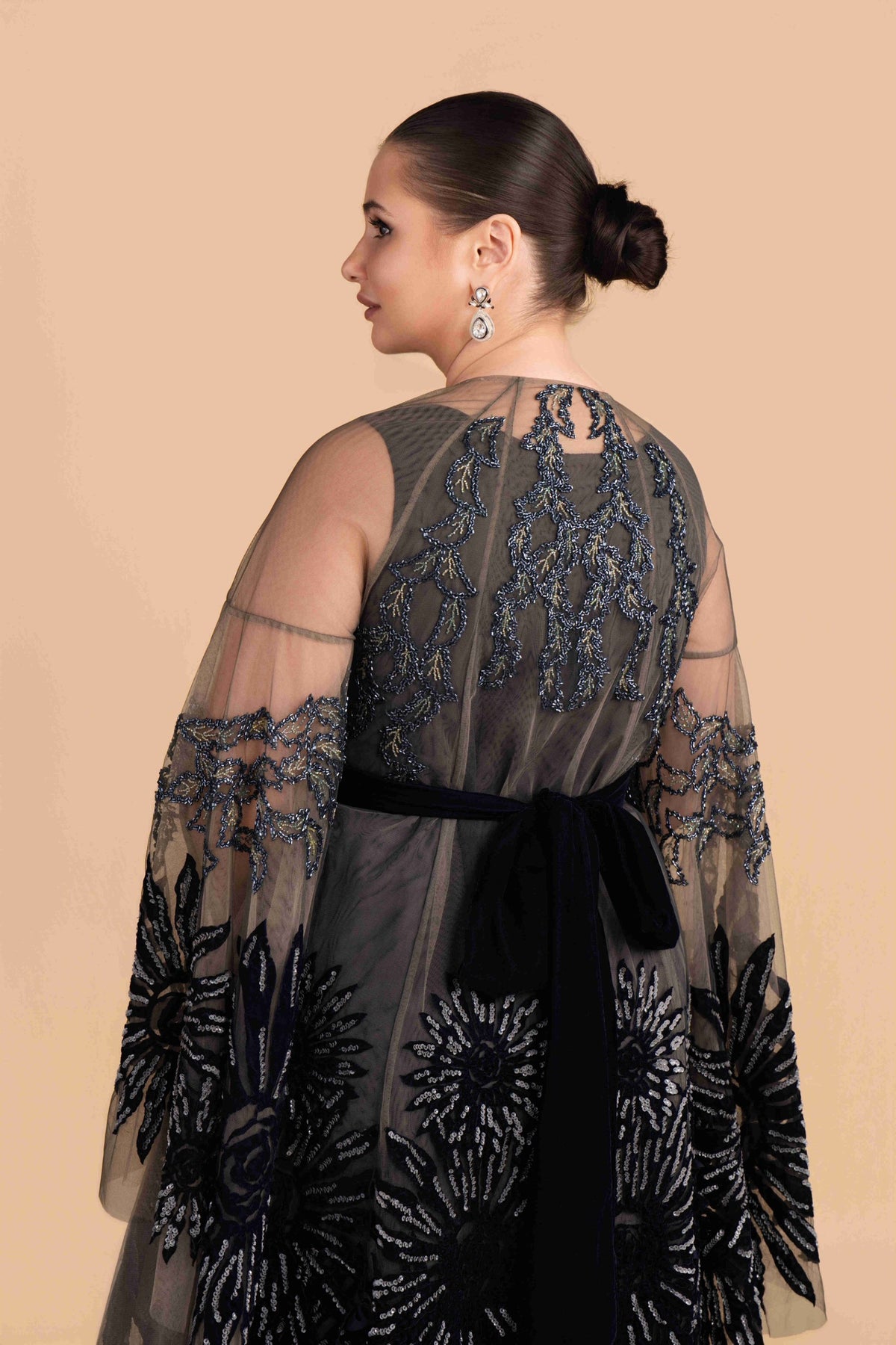 This dramatic layered cape pairs a sheer overlay with bold black threadwork and sequins, forming striking floral motifs across the sleeves and hem.