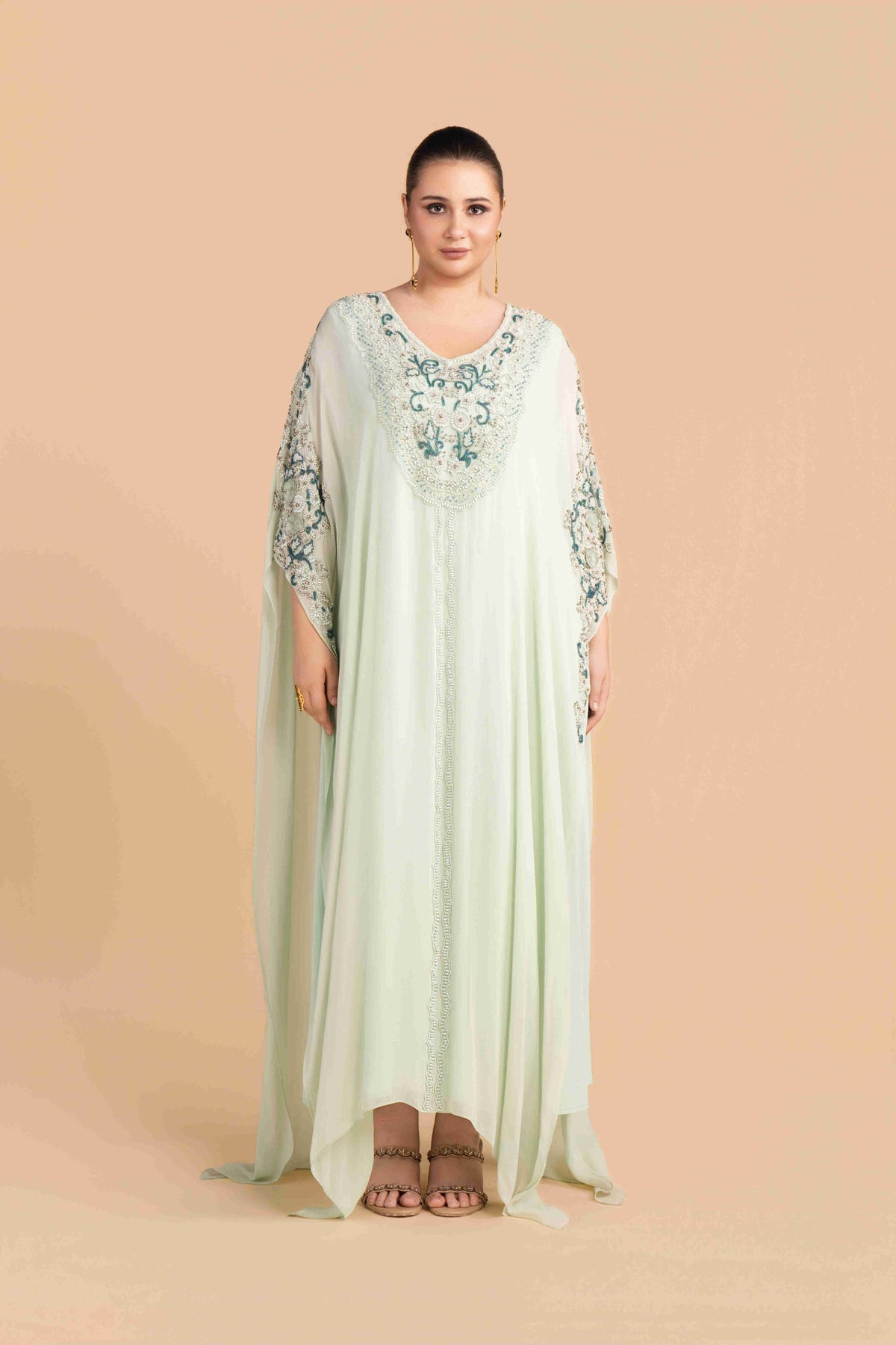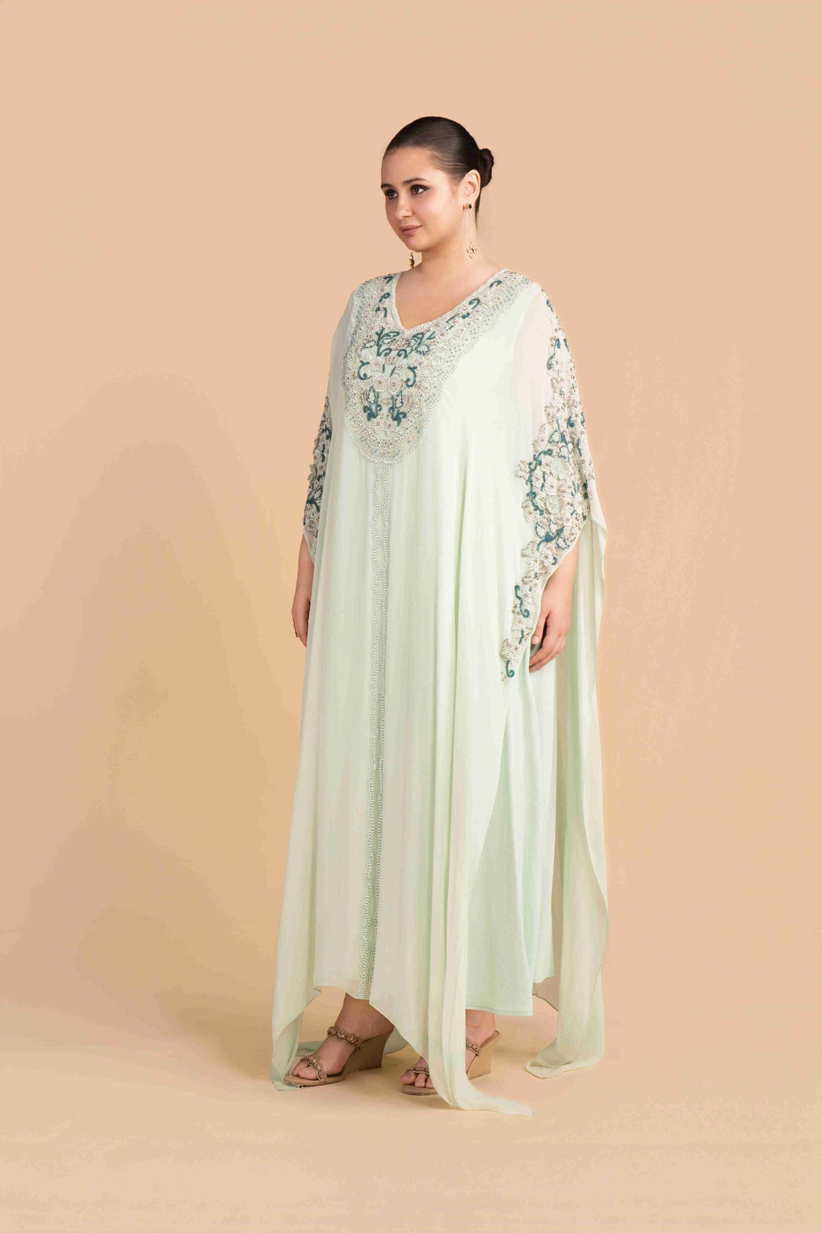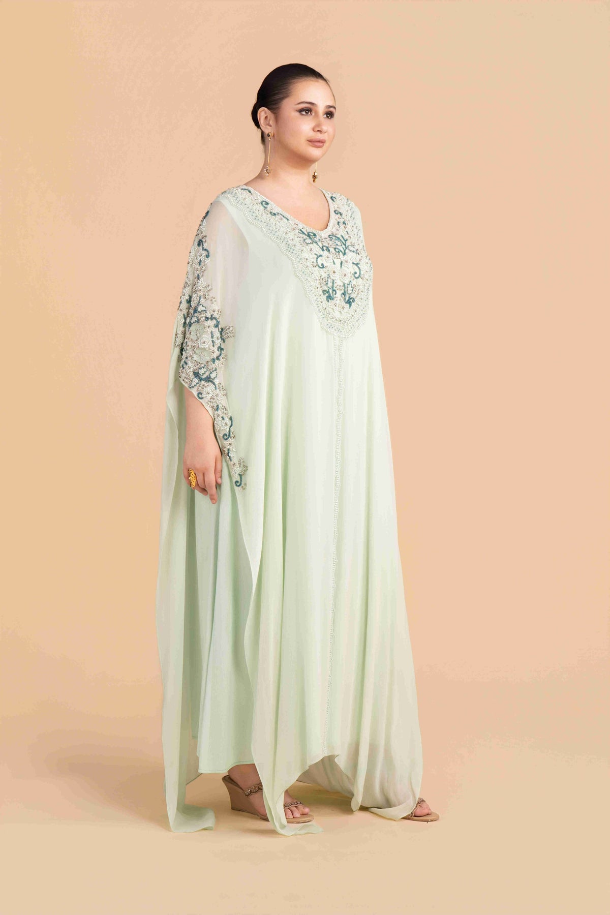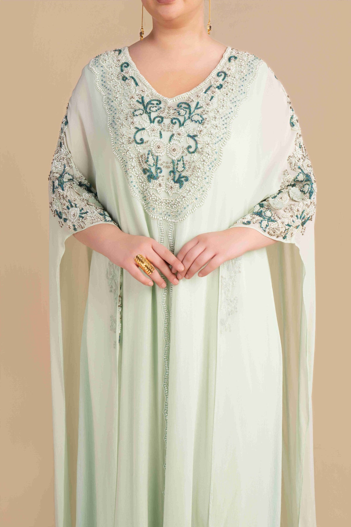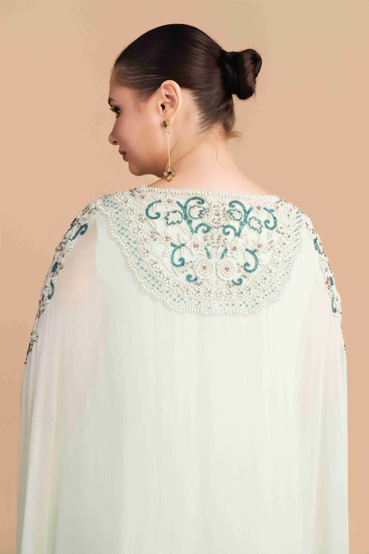Mint-toned florals and pastel sequins adorn this refreshing cape silhouette.