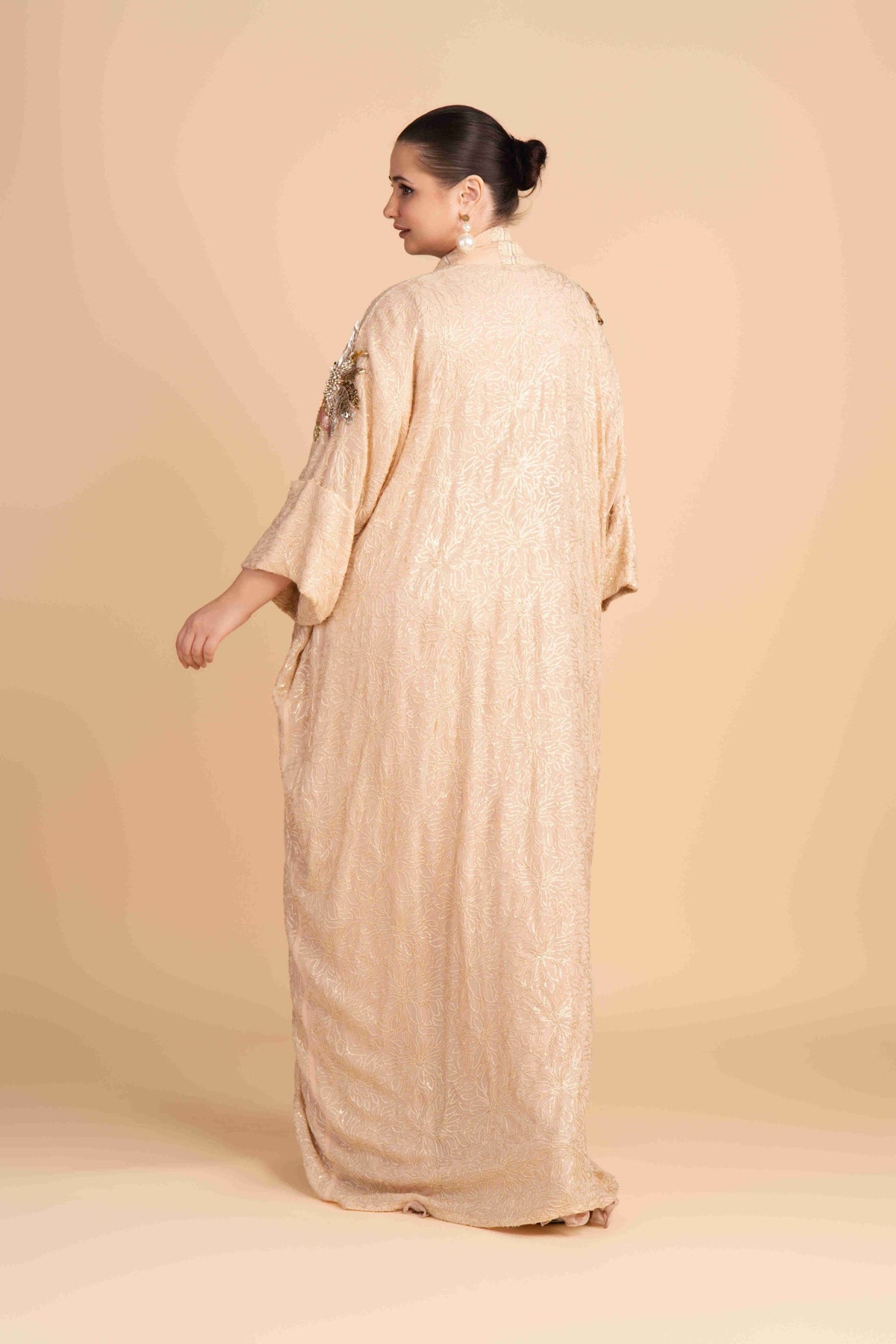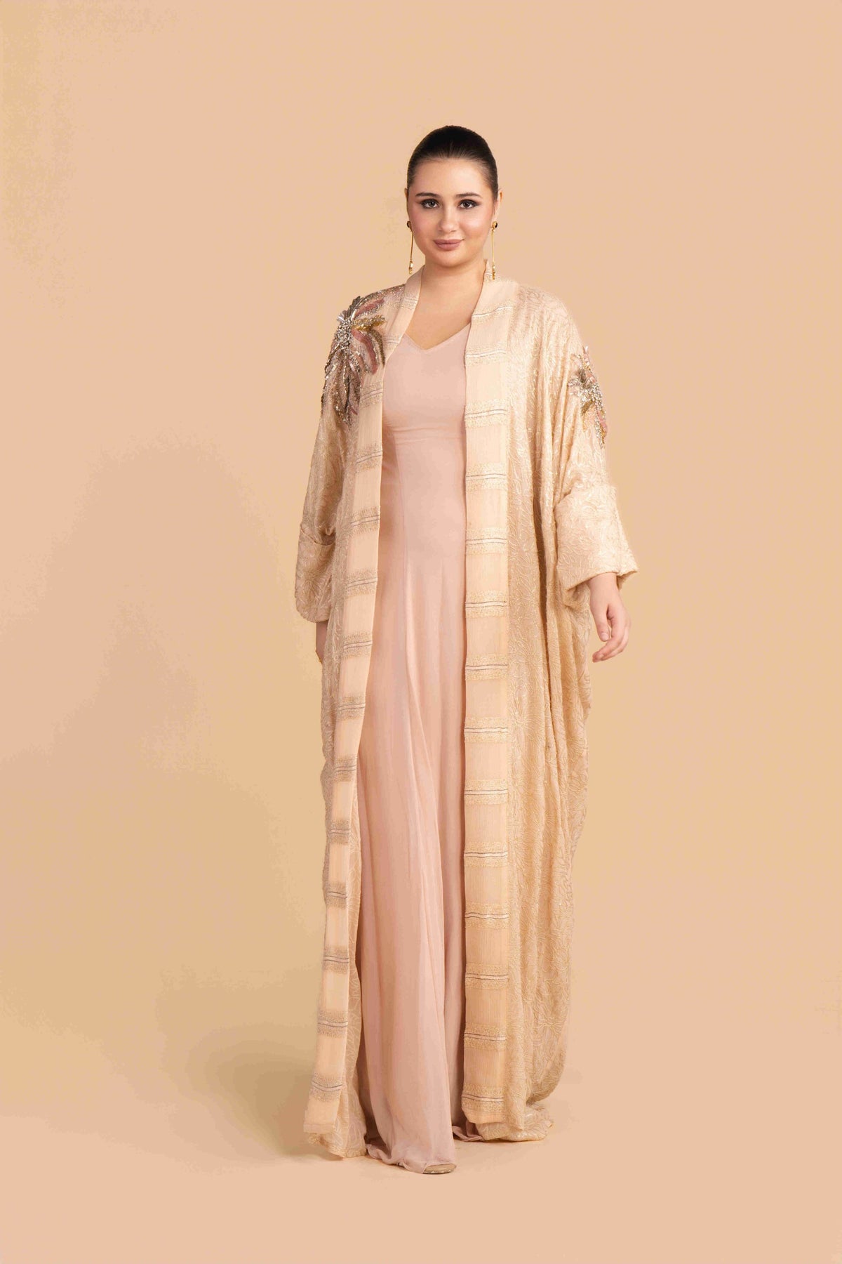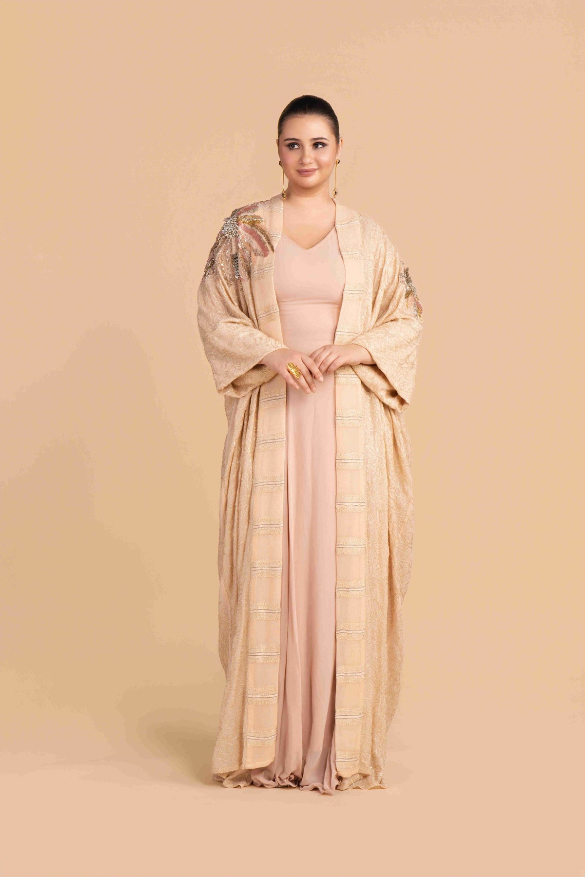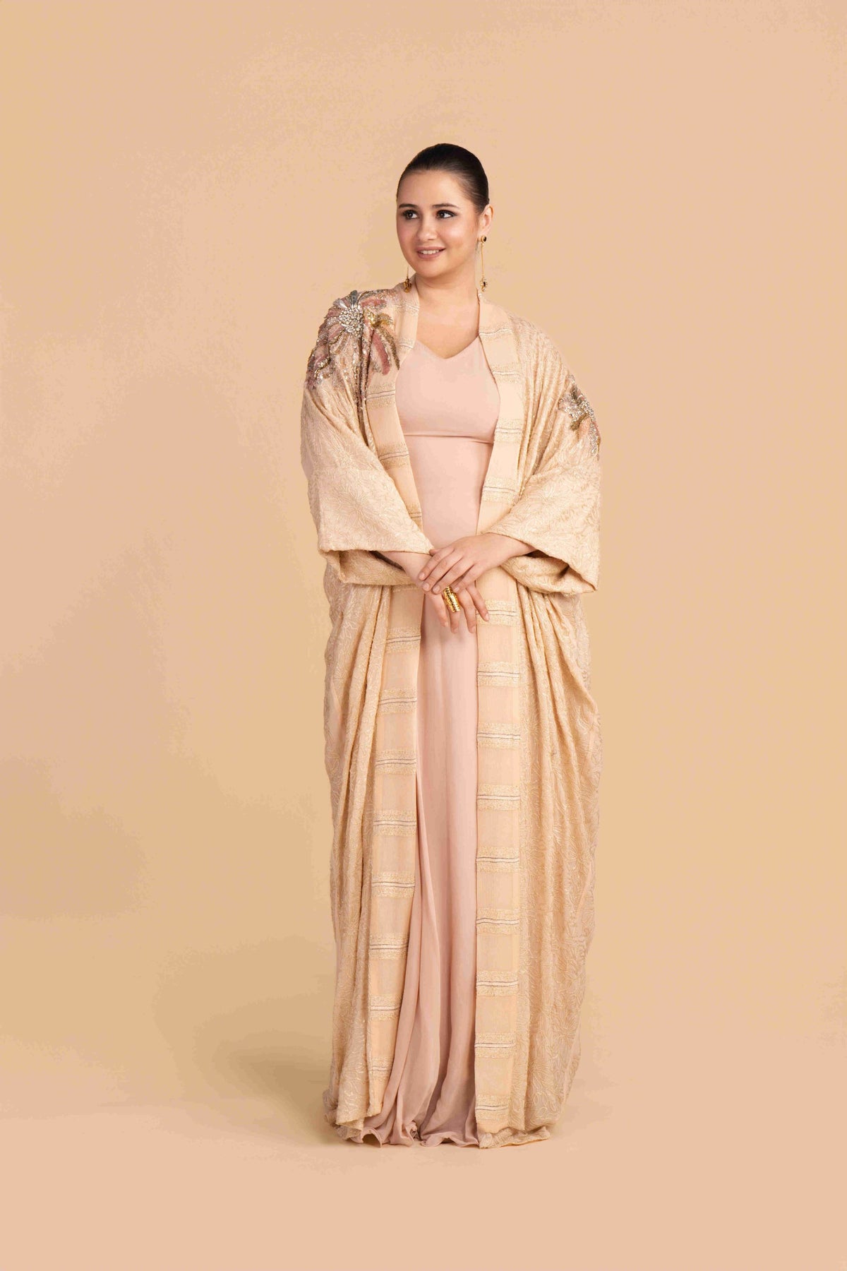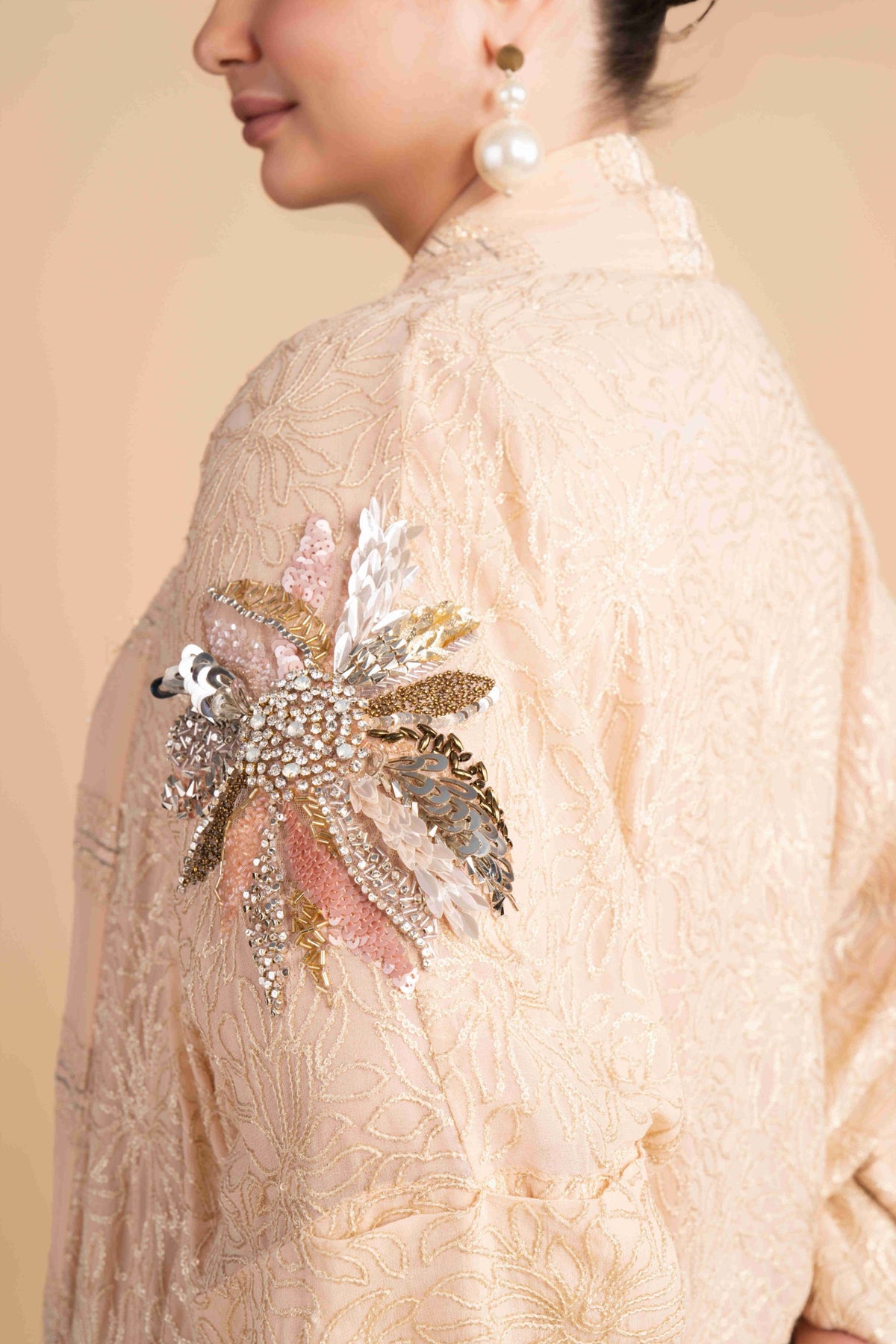 Crafted with rose gold threadwork and sequins, this cape elevates modern festive dressing.