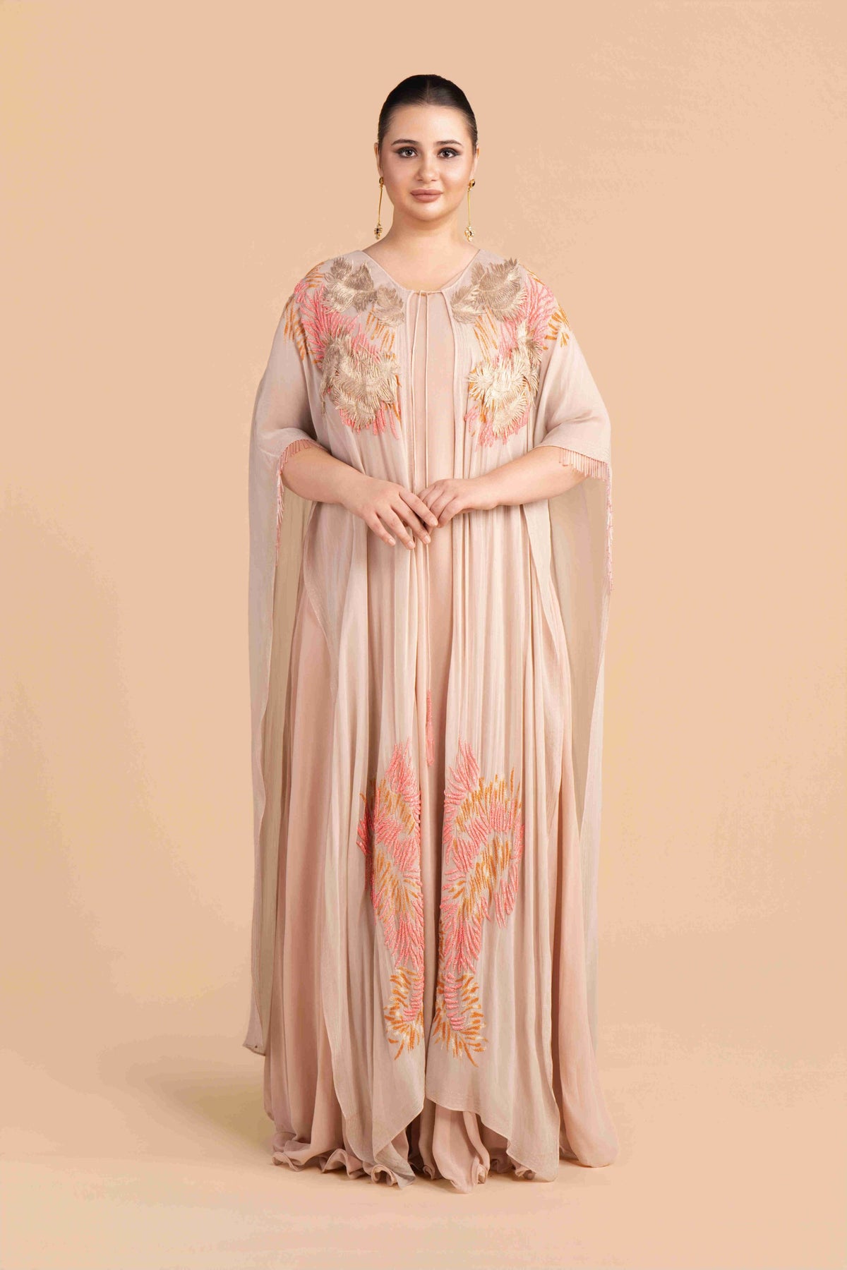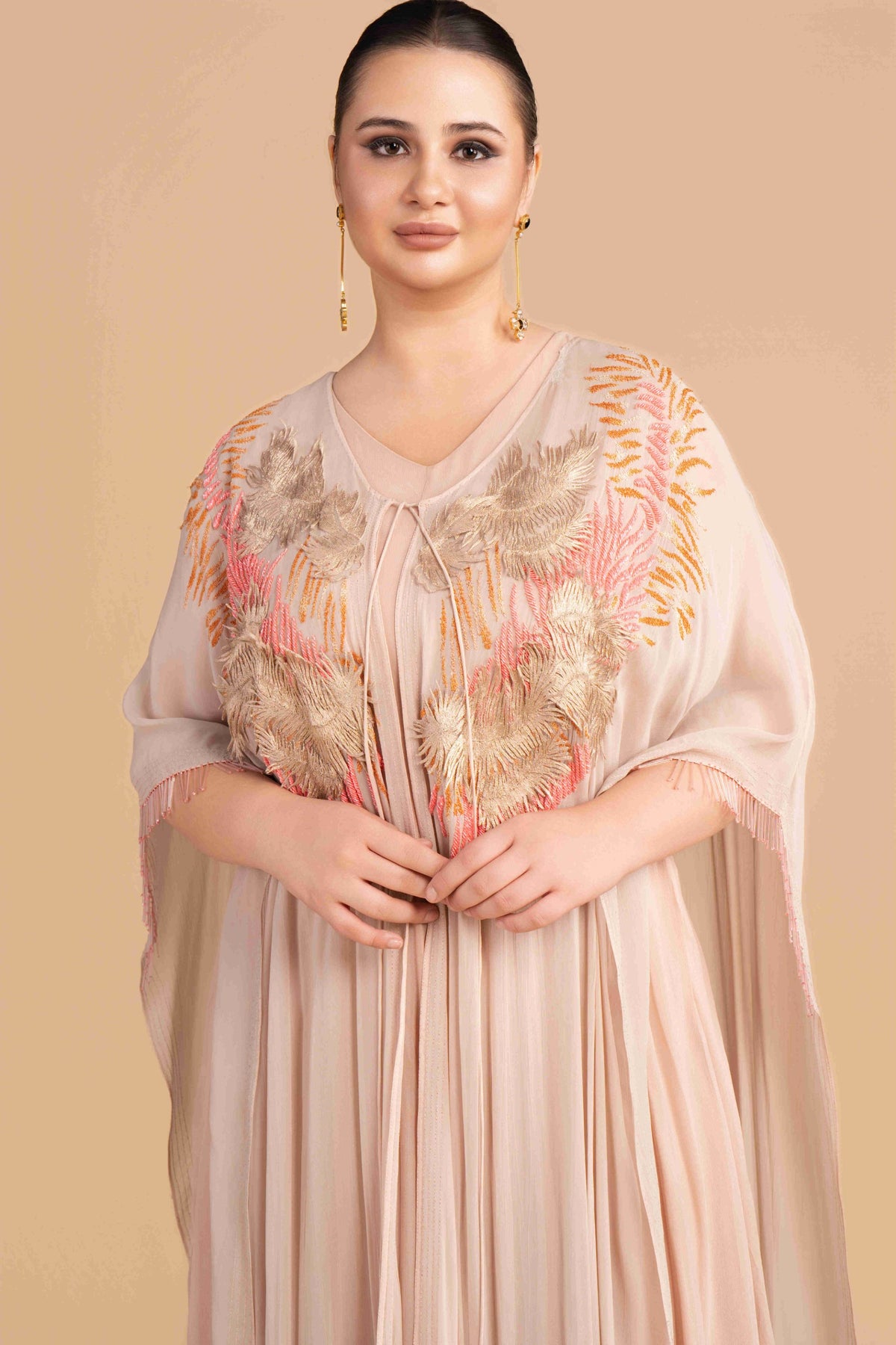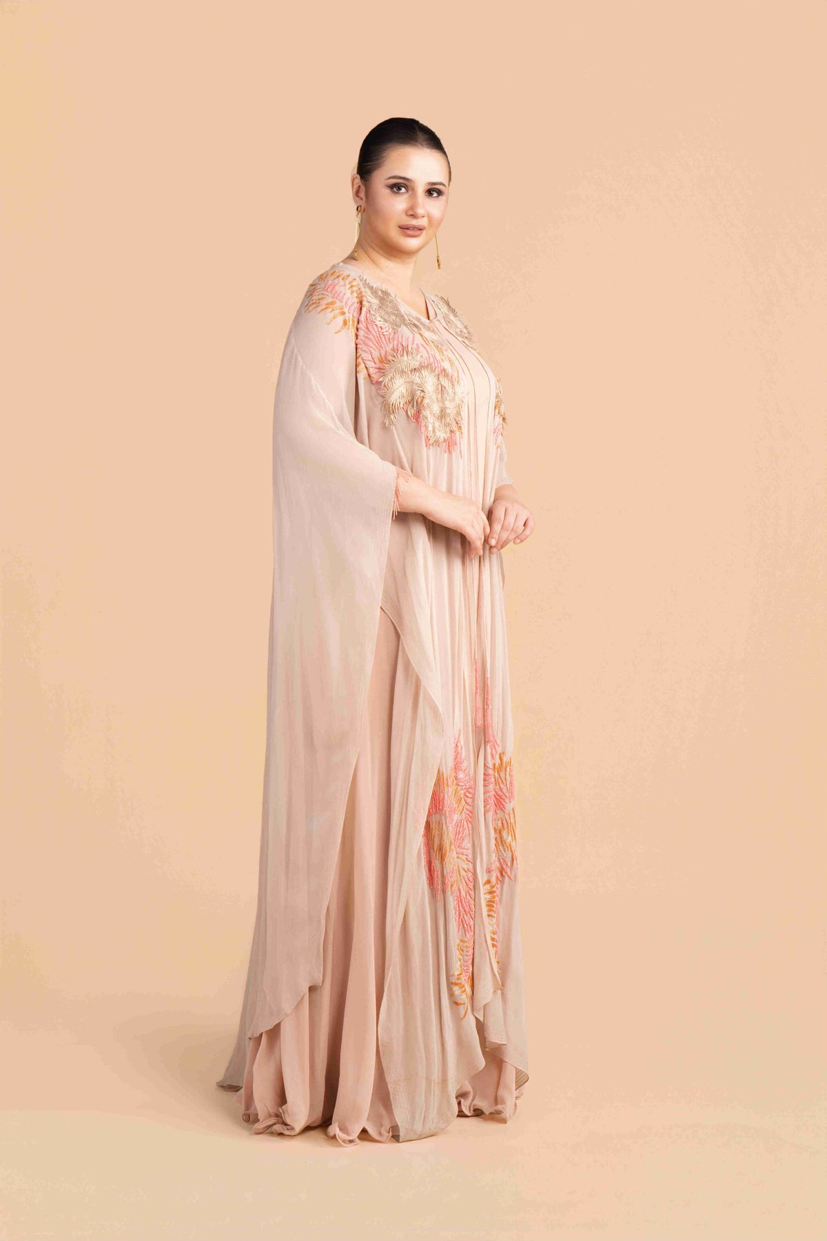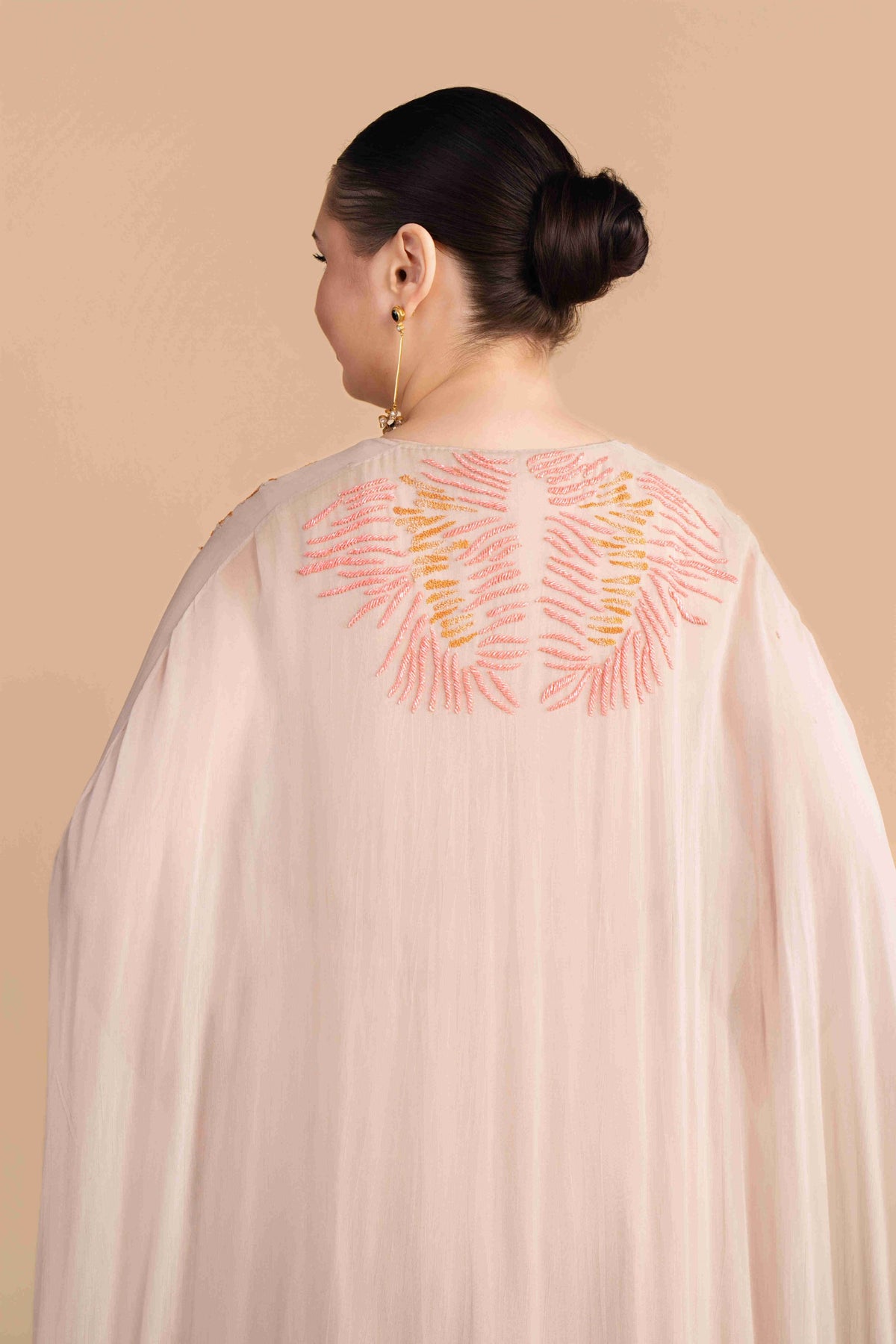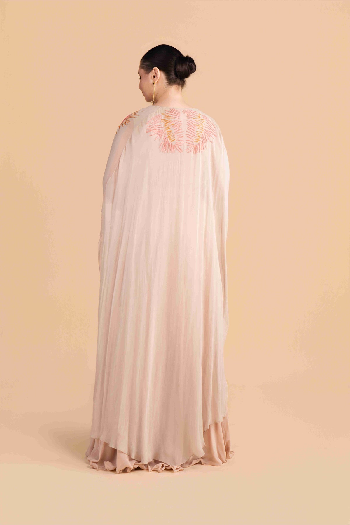 Soft- blush toned florals bloom across a fluid cape, embelliished with micro sequins for soft sparkle.