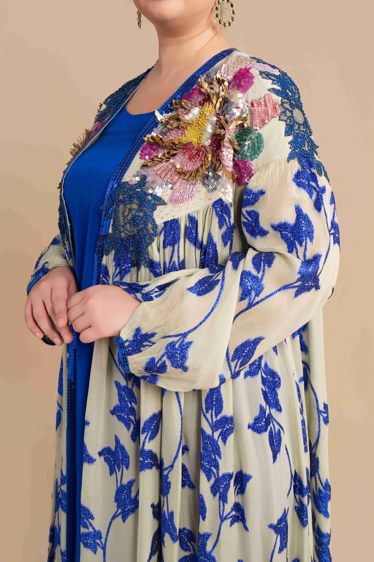 Mint-toned florals and pastel sequins adorn this refreshing cape silhouette.