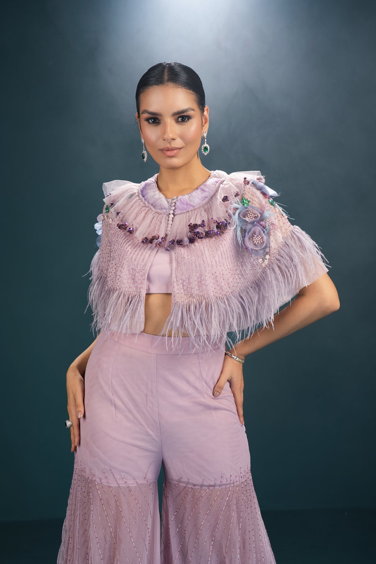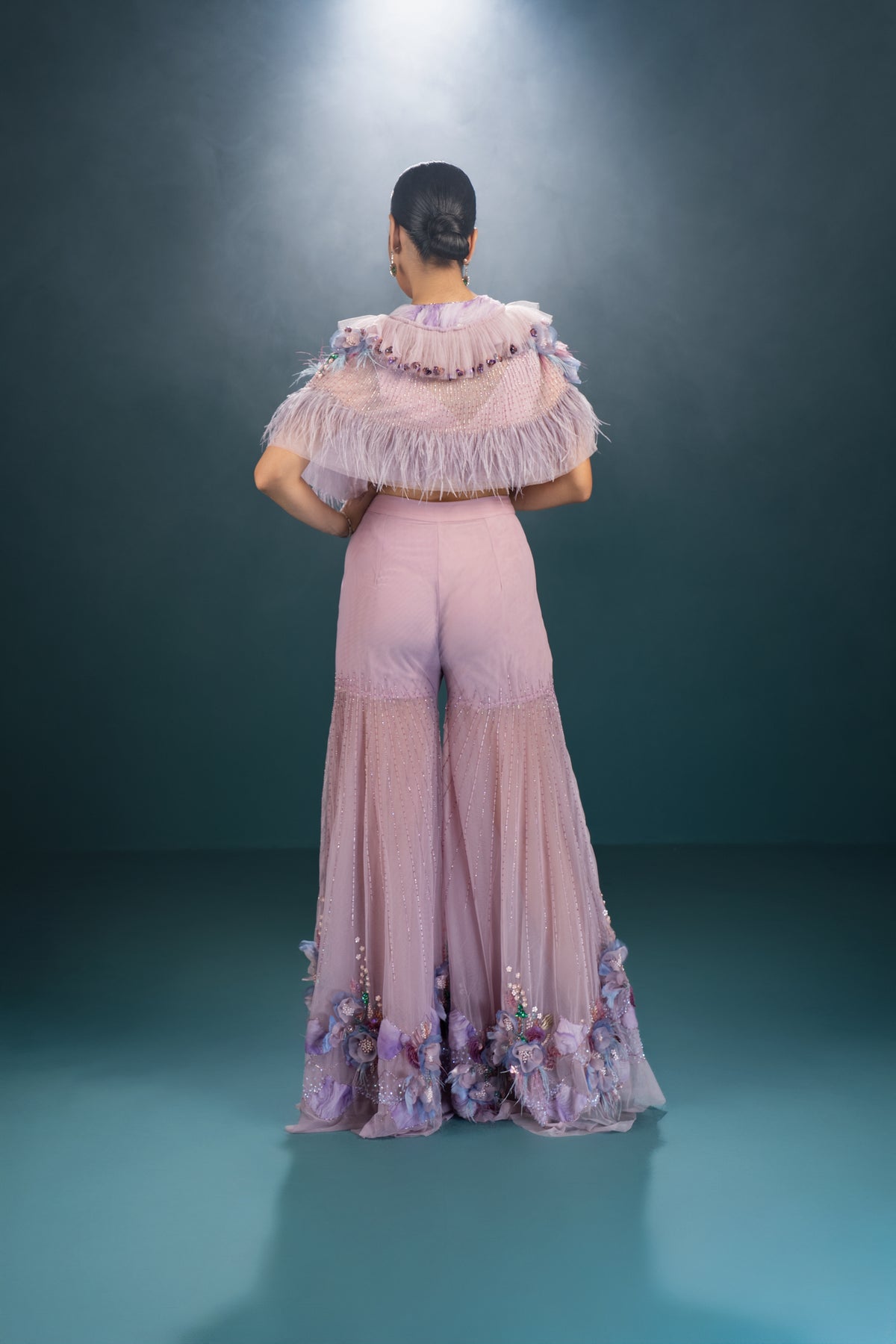 Lilac Dust Garara Set is intricately hand-embroidered using marquise sequins and bugle beads. Comes with lilac sequins with feather drama and hand applique cutdana work.