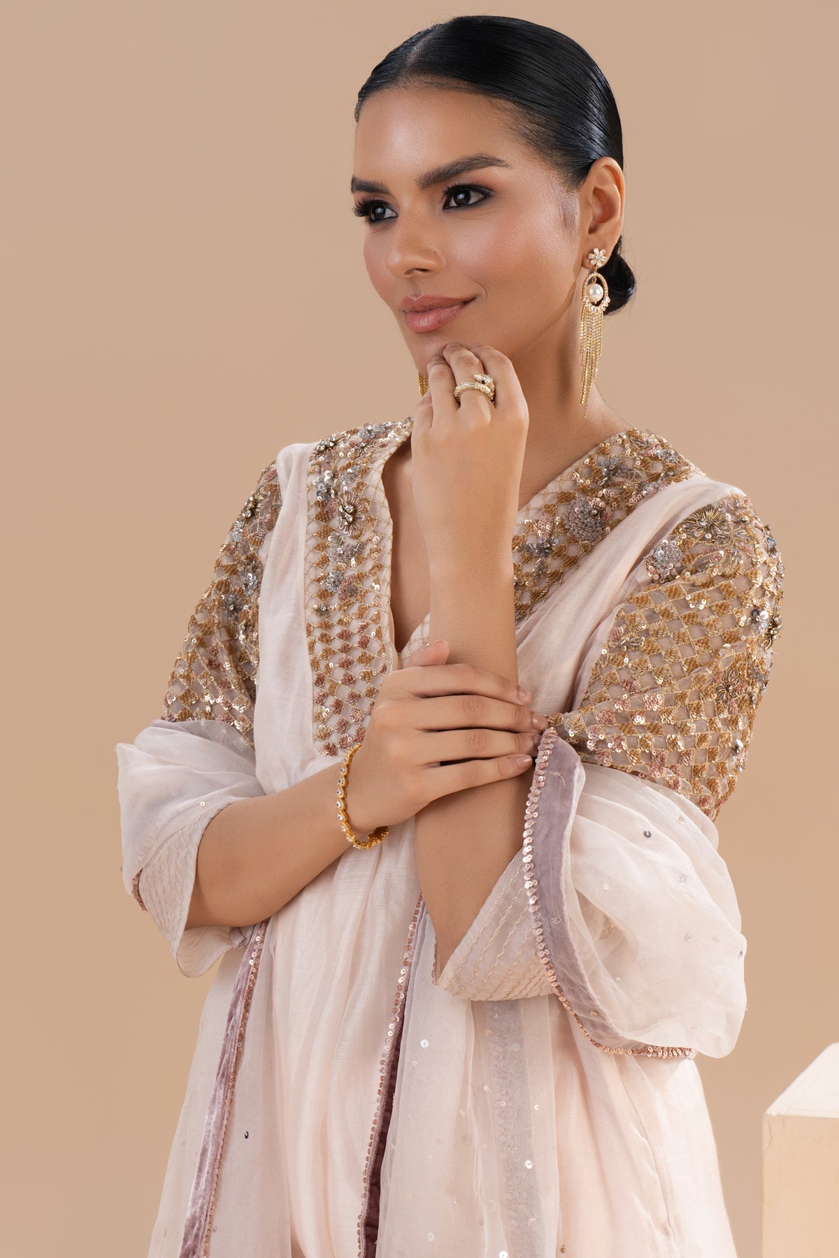 Peach and gold color suit set, embedded with intricate zari bead work, highlighted with sequins. The dupatta has intricate zari artwork. The suit set has three components: trouser, kurta, and dupatta.