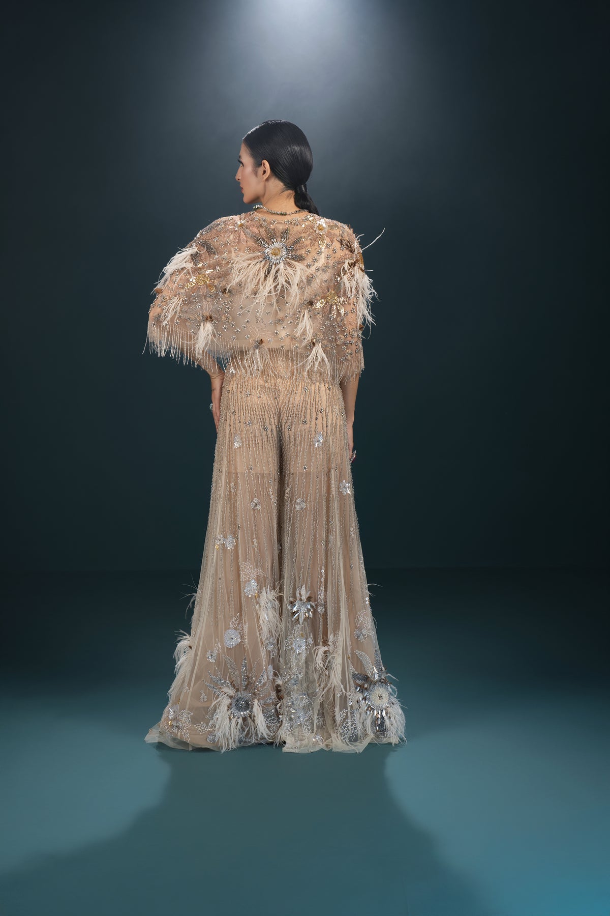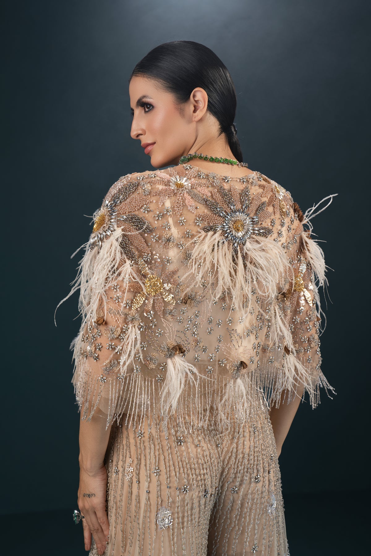 Petal Pastels is intricately hand-embroidered. The cape is fully embroidered using pearl and bugle beads, has feather trim, and comes with full lining inside. The garara has fully sunflowers embroidery.