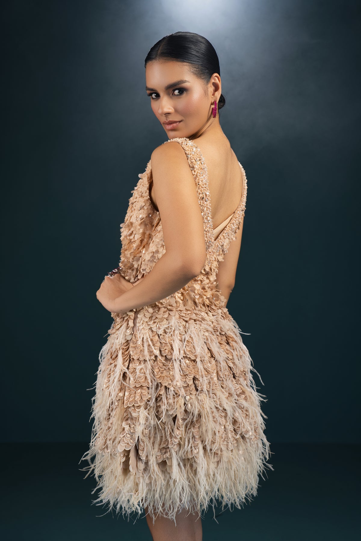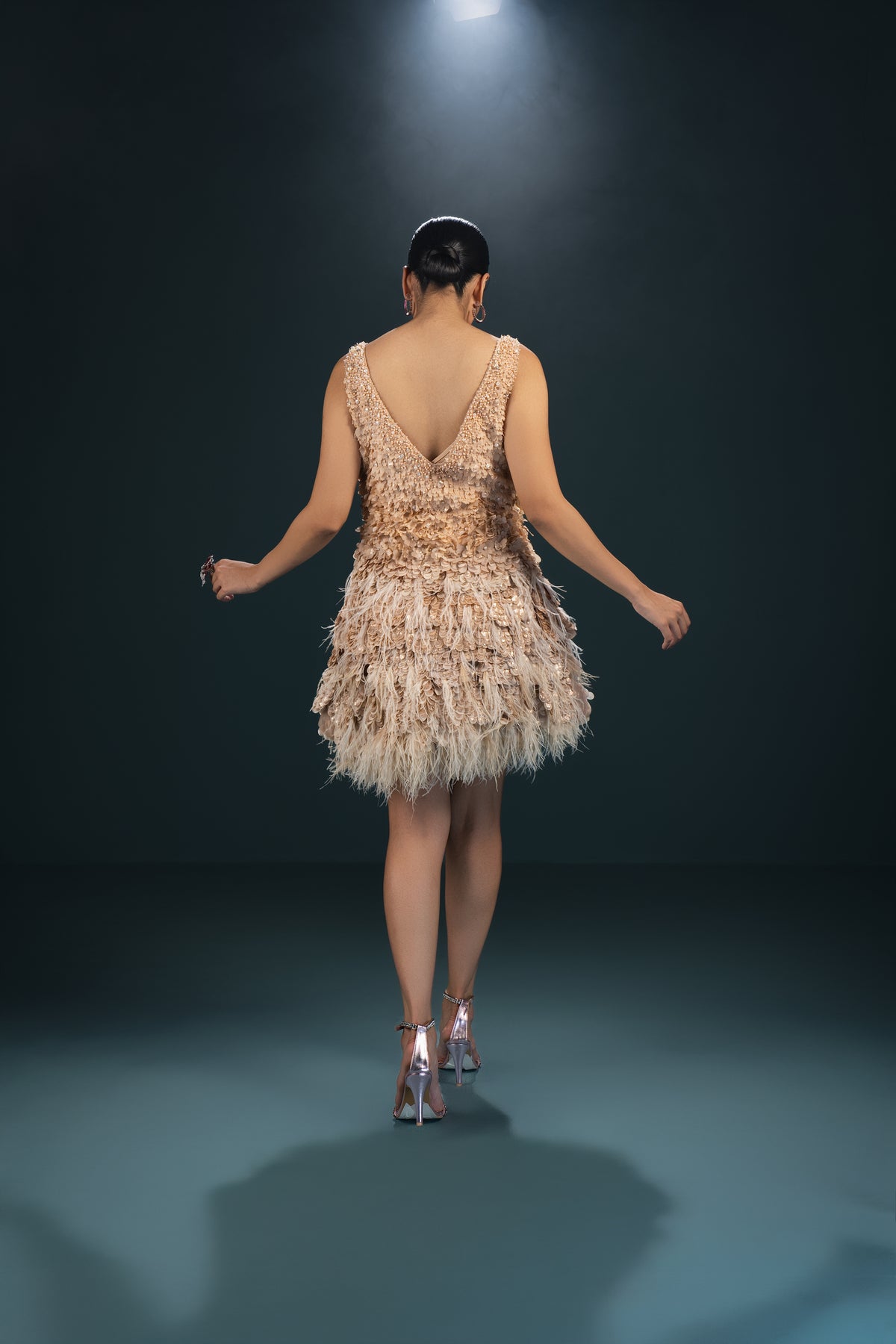 Step Into A World Of Enchanting Gradient With Our Midi Dress, A Stunning Fusion Of Beige Ombré. Featuring Precise Laser-Cut Patterns And A Feathered Hem, This Dress Creates A Captivating Play Of Color And Texture, Turning Every Movement Into A Magical Experience.