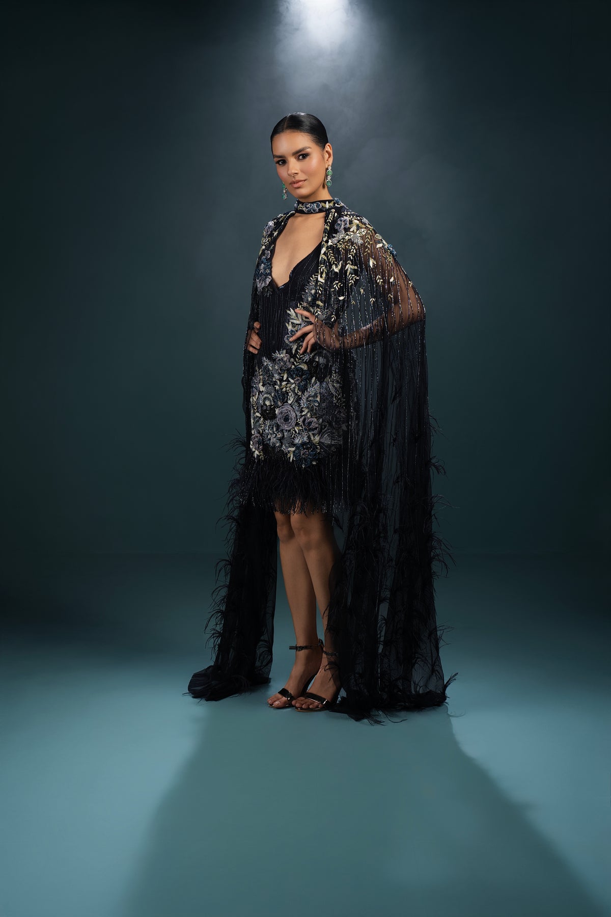 Features Intricate,Dence Floral Embroidery And Applique Across The Bodice Mini Dress.