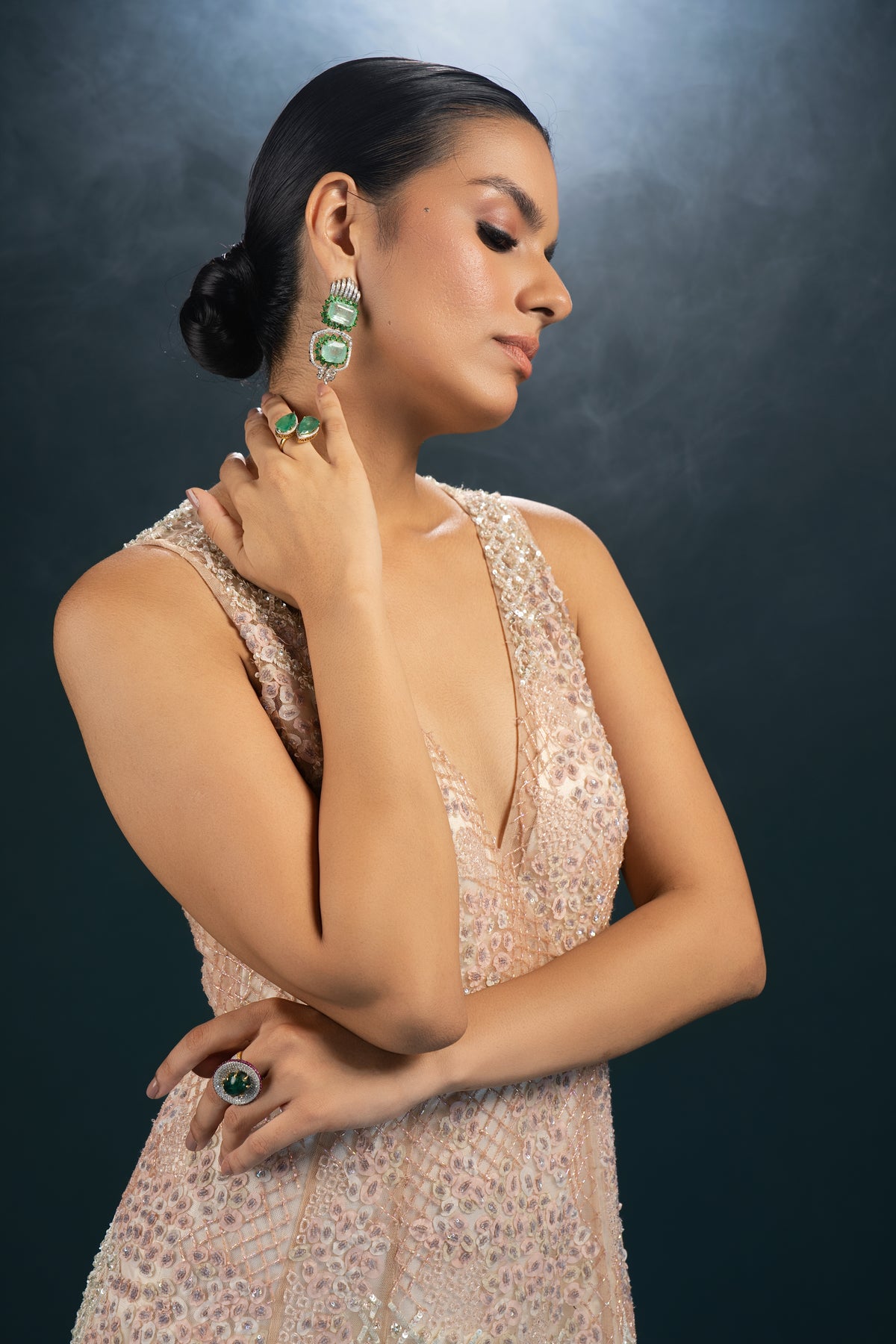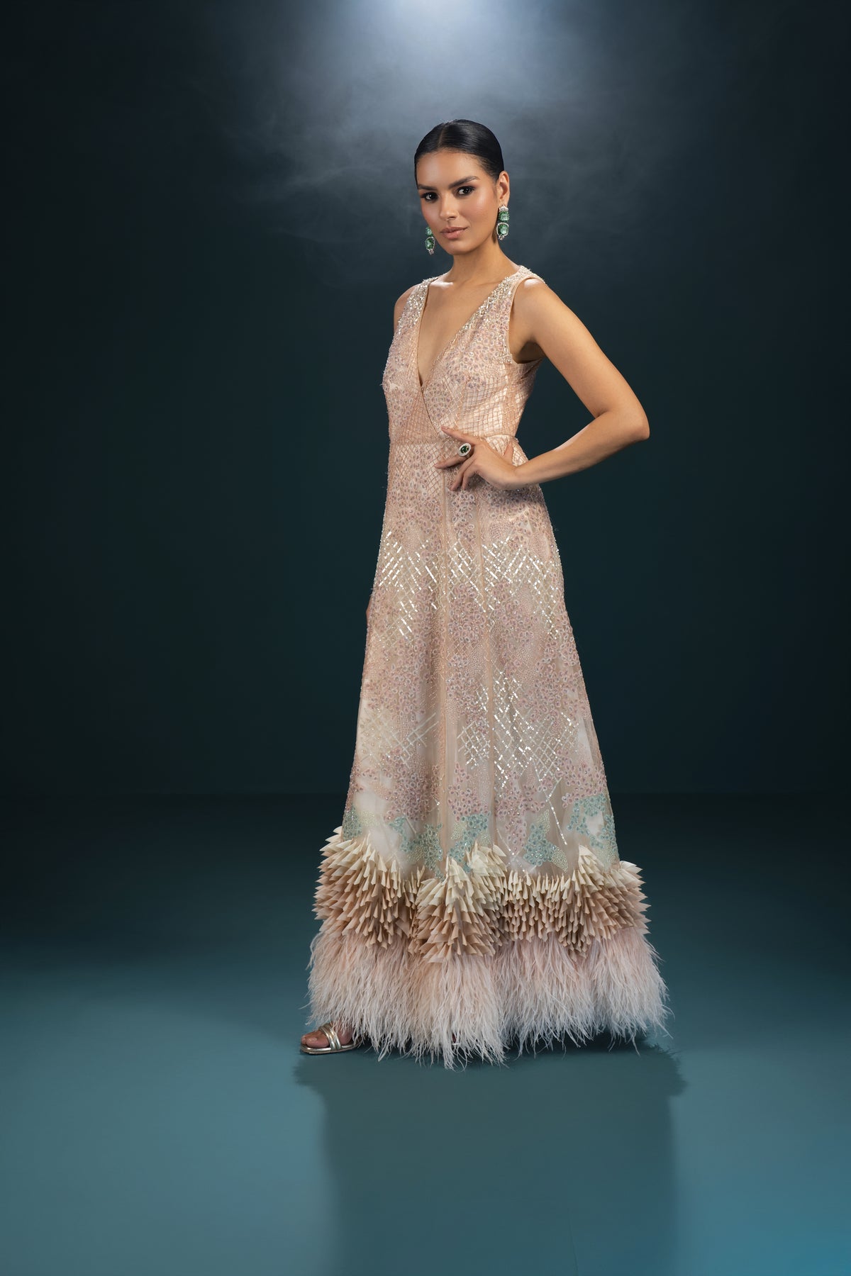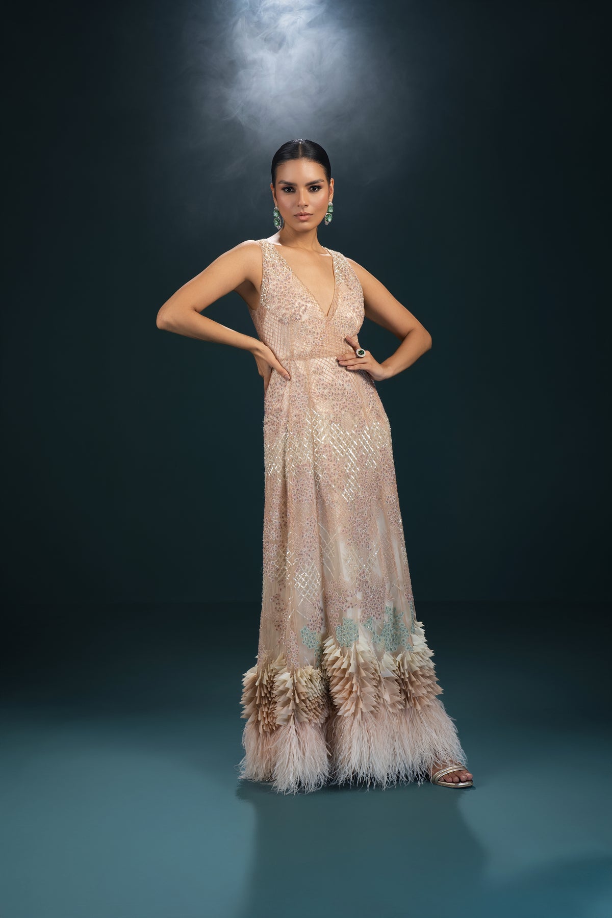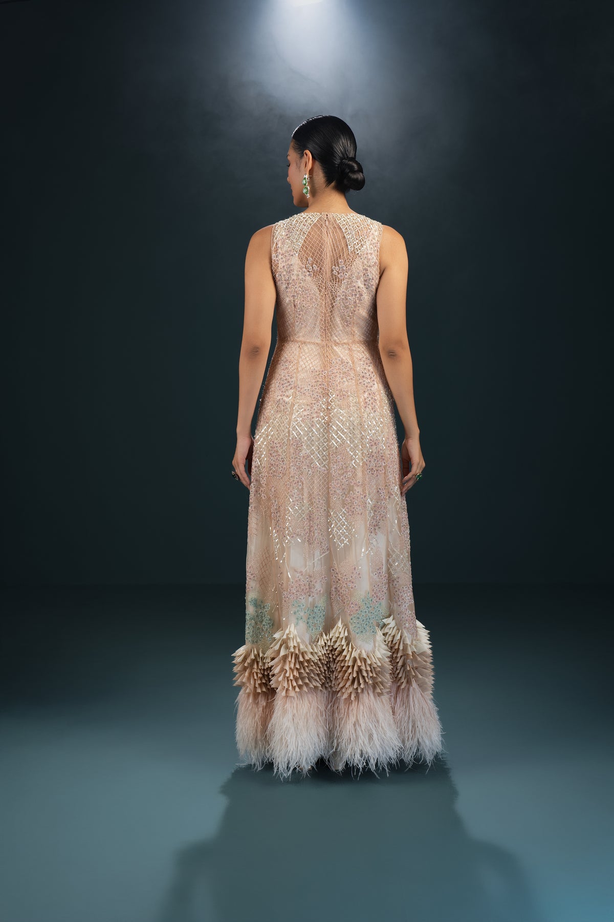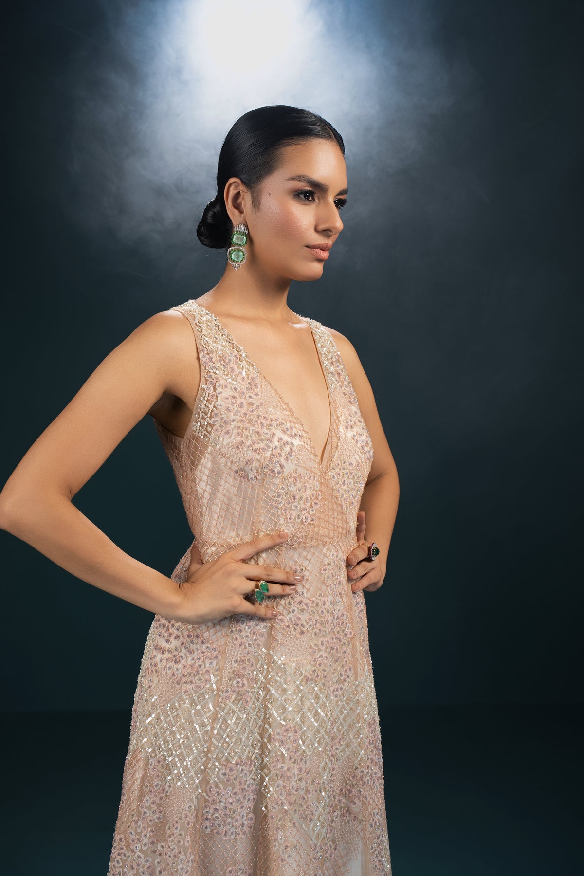 This Dress Display A Highly Ornate,Floor Length Gown Paired With A Sheer Dramatic Dress The Entire Ensemble Is A Soft Delicate Shade.