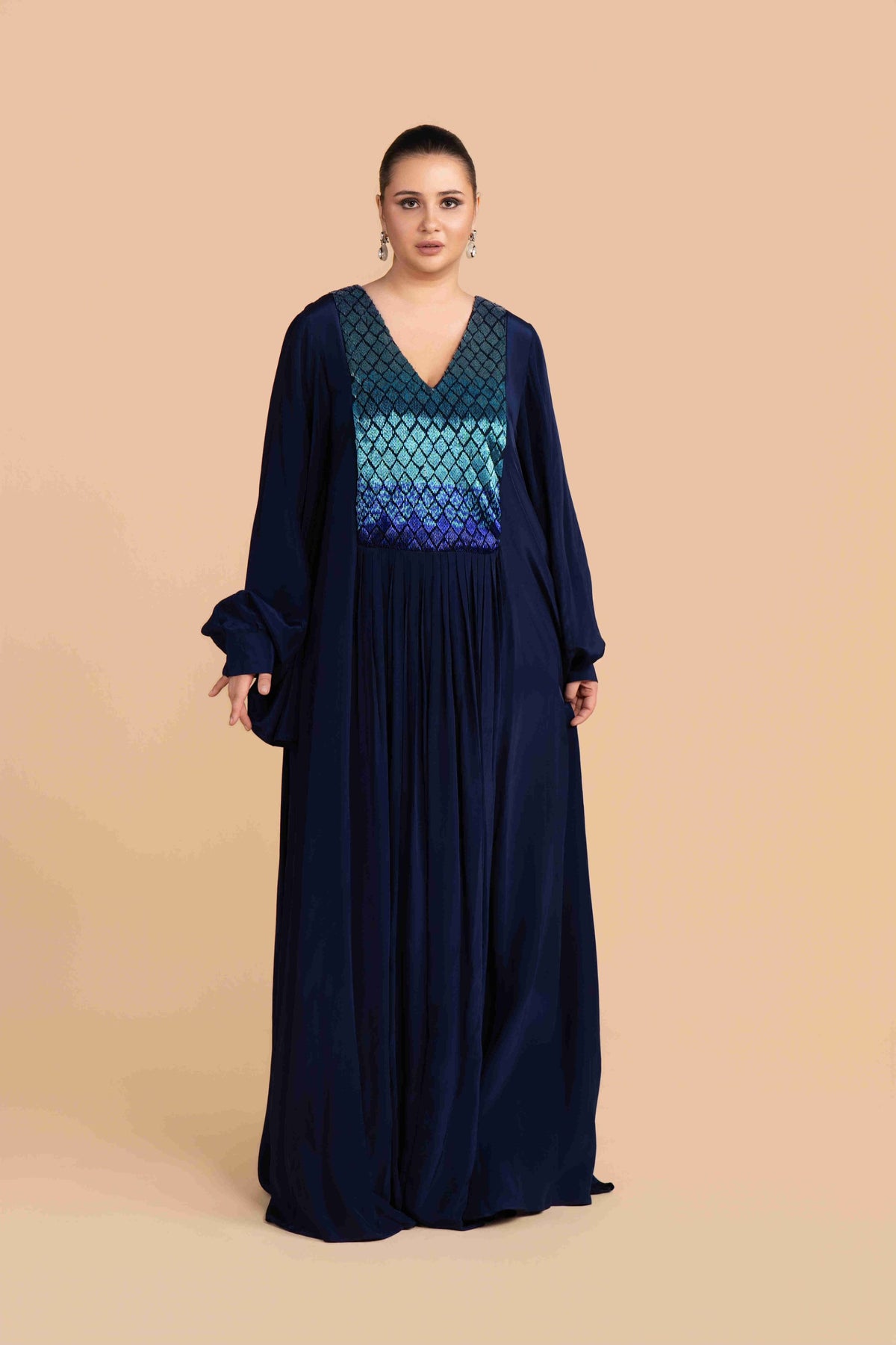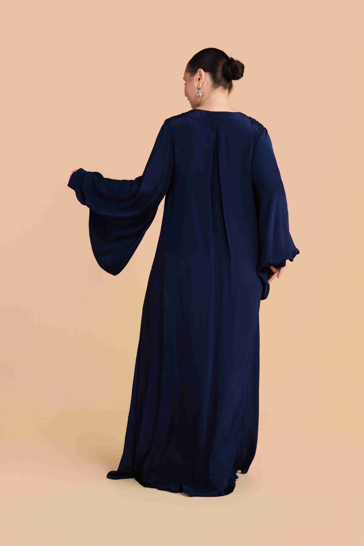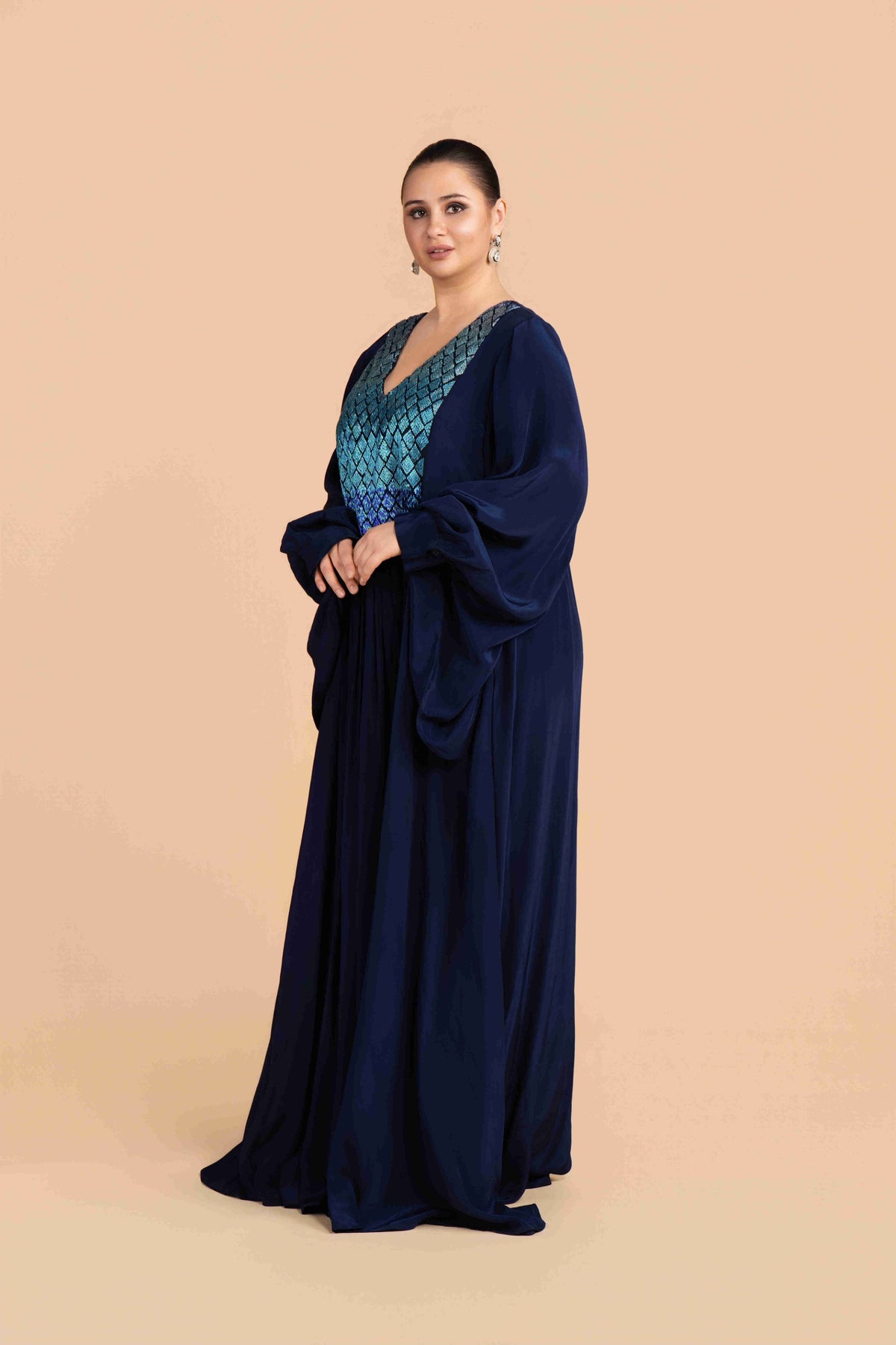 A luxurious kaftan in navy hue with crystal bead work and sequin highlights.