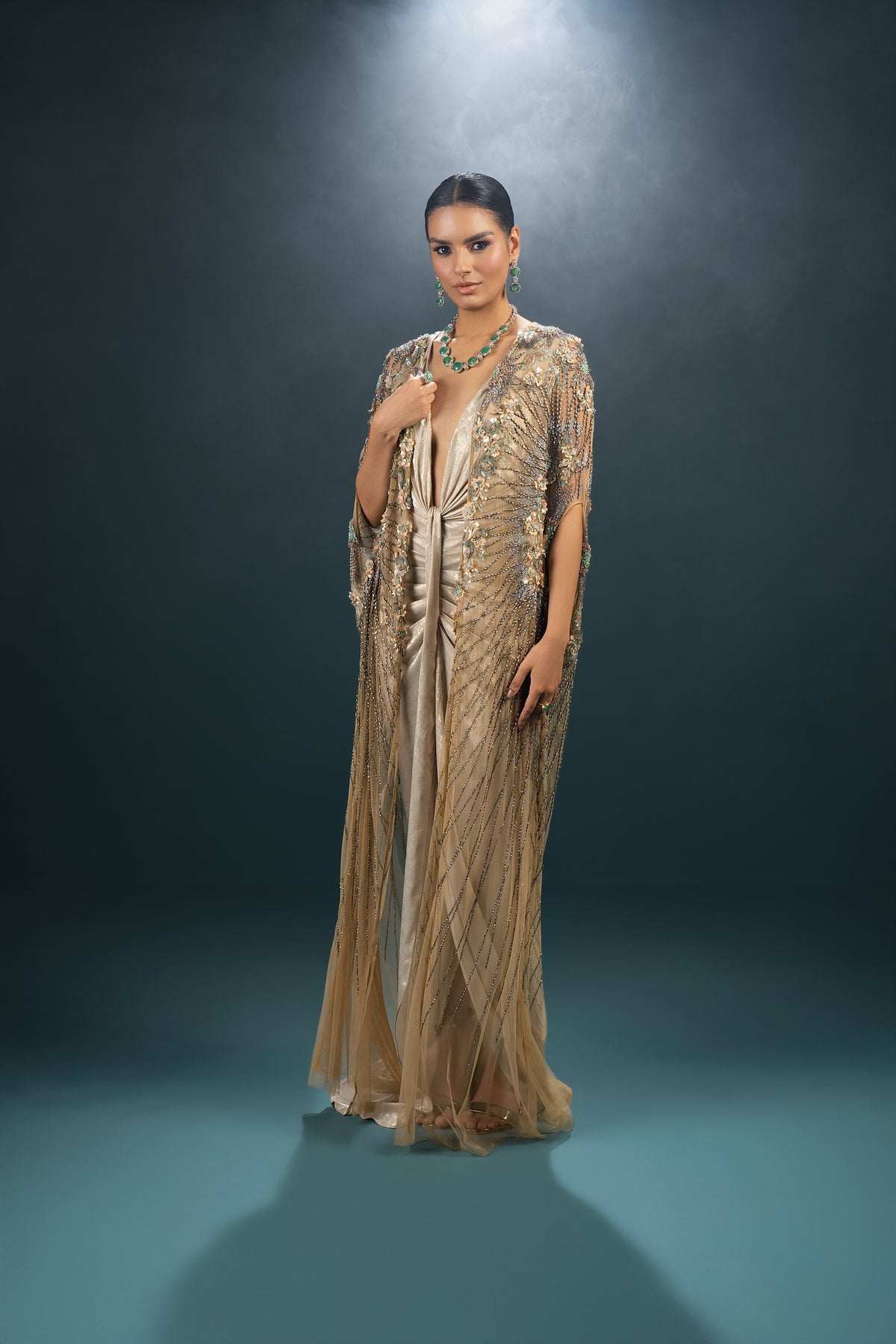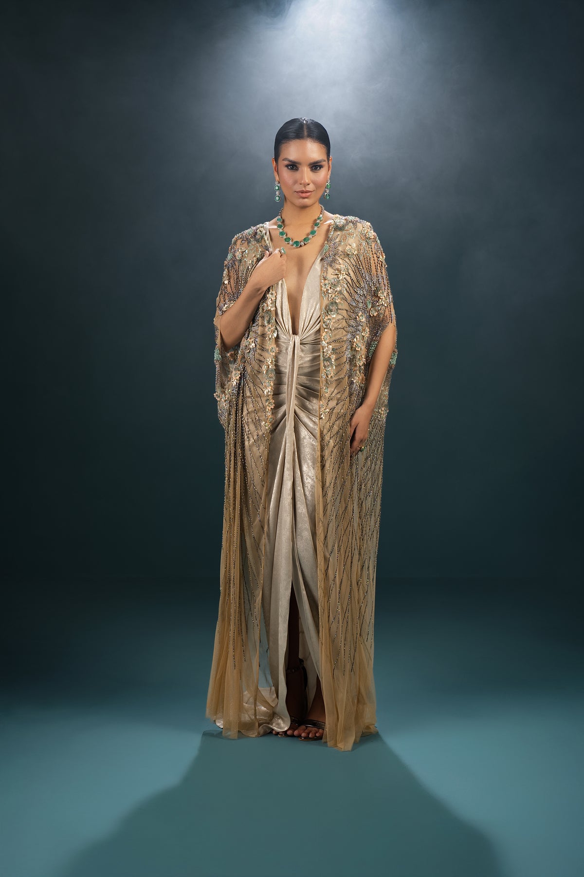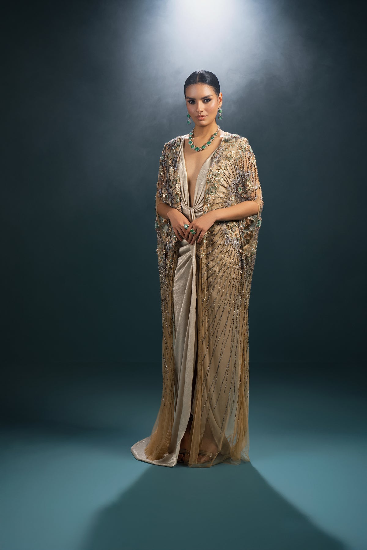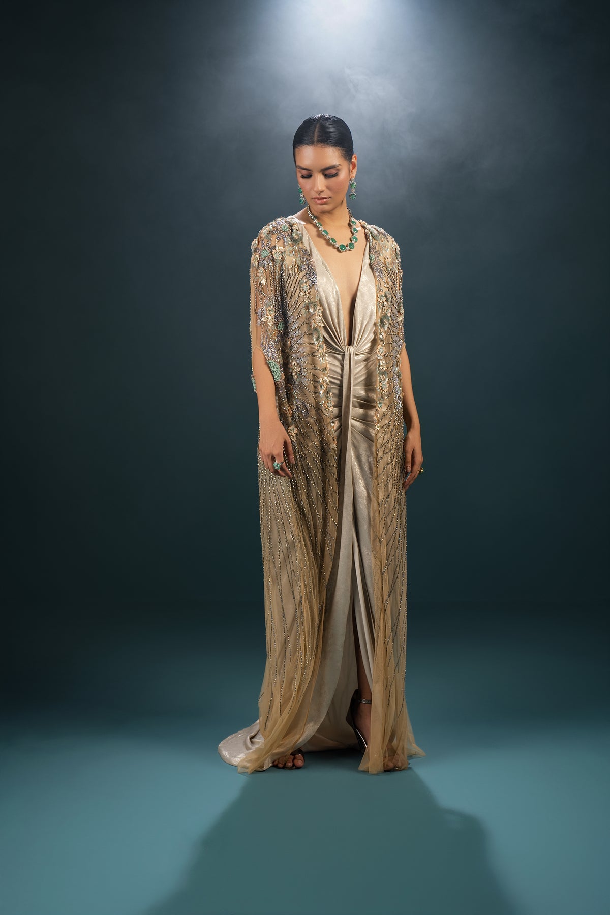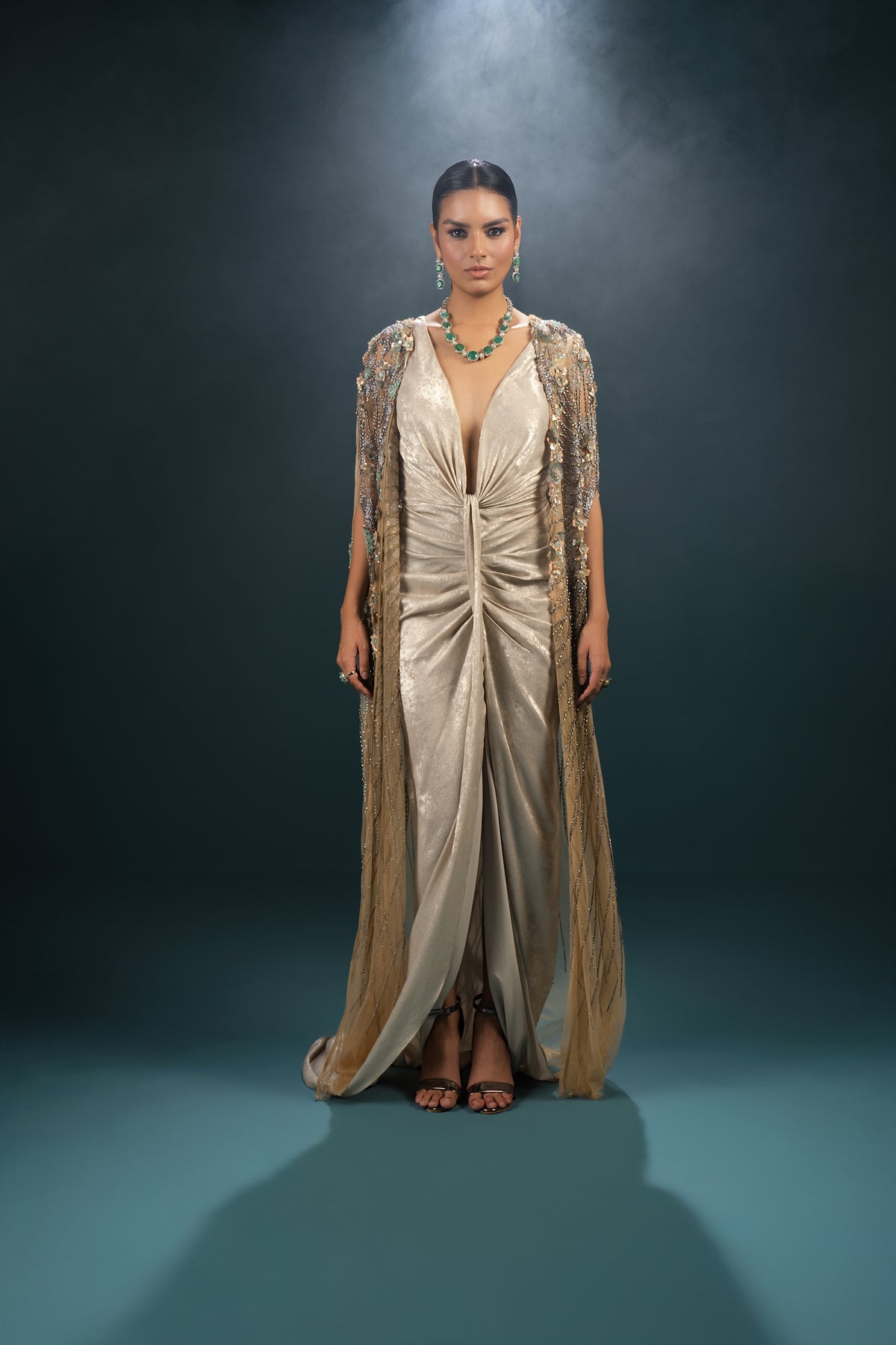 The Floral Knotted Dress Is A Seamless Blend Of Elegance And Modern Allure Designed For Those Who Crave Timeless Beauty With A Touch Of Contemporary Grace Made From Luxurious Beige Lurex Fabric This Dress Radiates A Subtle Shimmering Glow That Catches The Light With Every Movement Along With A Beautiful And Elaborate Trail Giving You An Effortlessly Radiant Aura