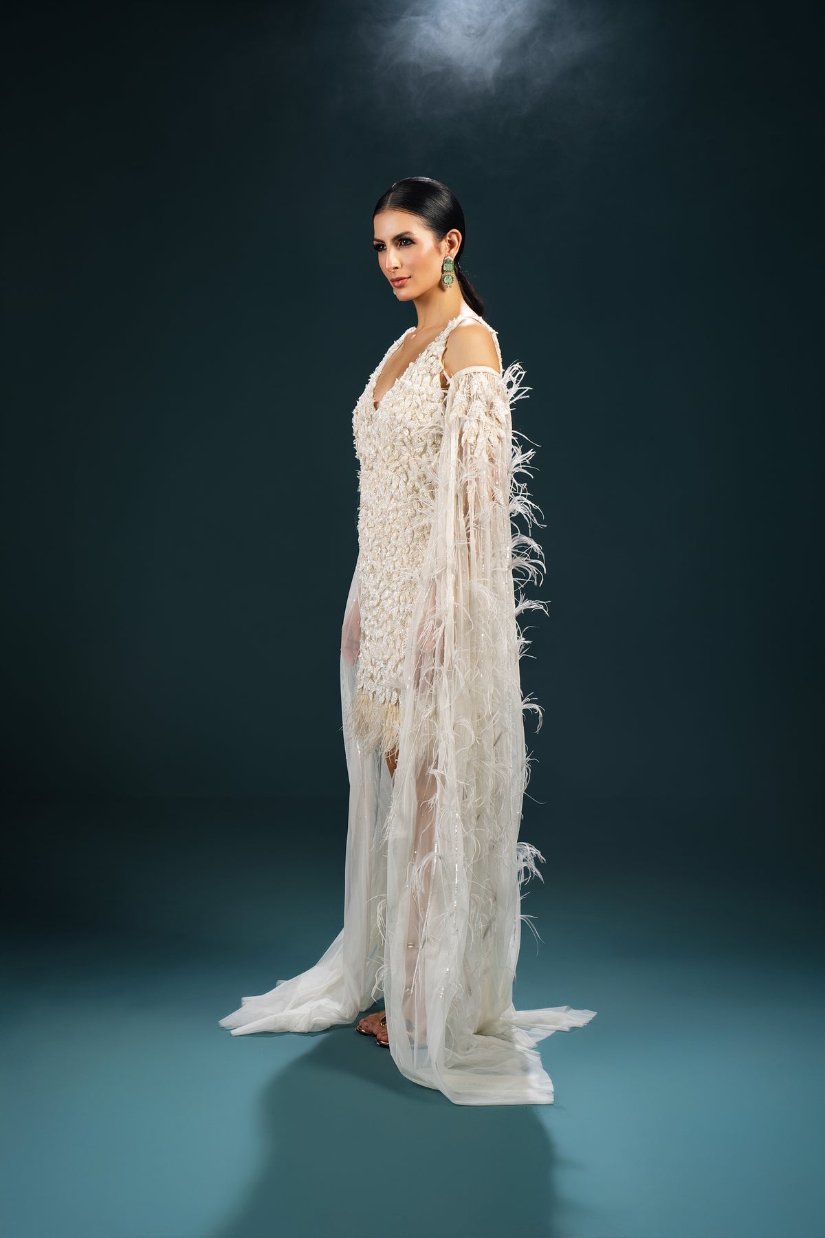Soft Feathers Around The Cape Introduce A Playful Touch And Providing A Graceful Flow As You Move.