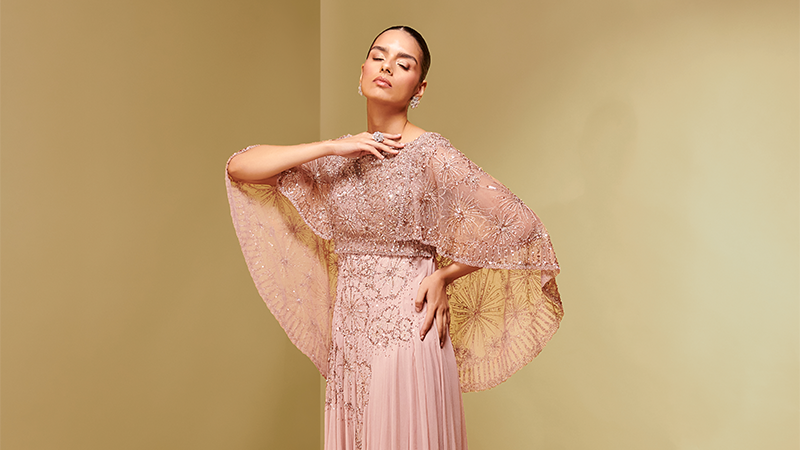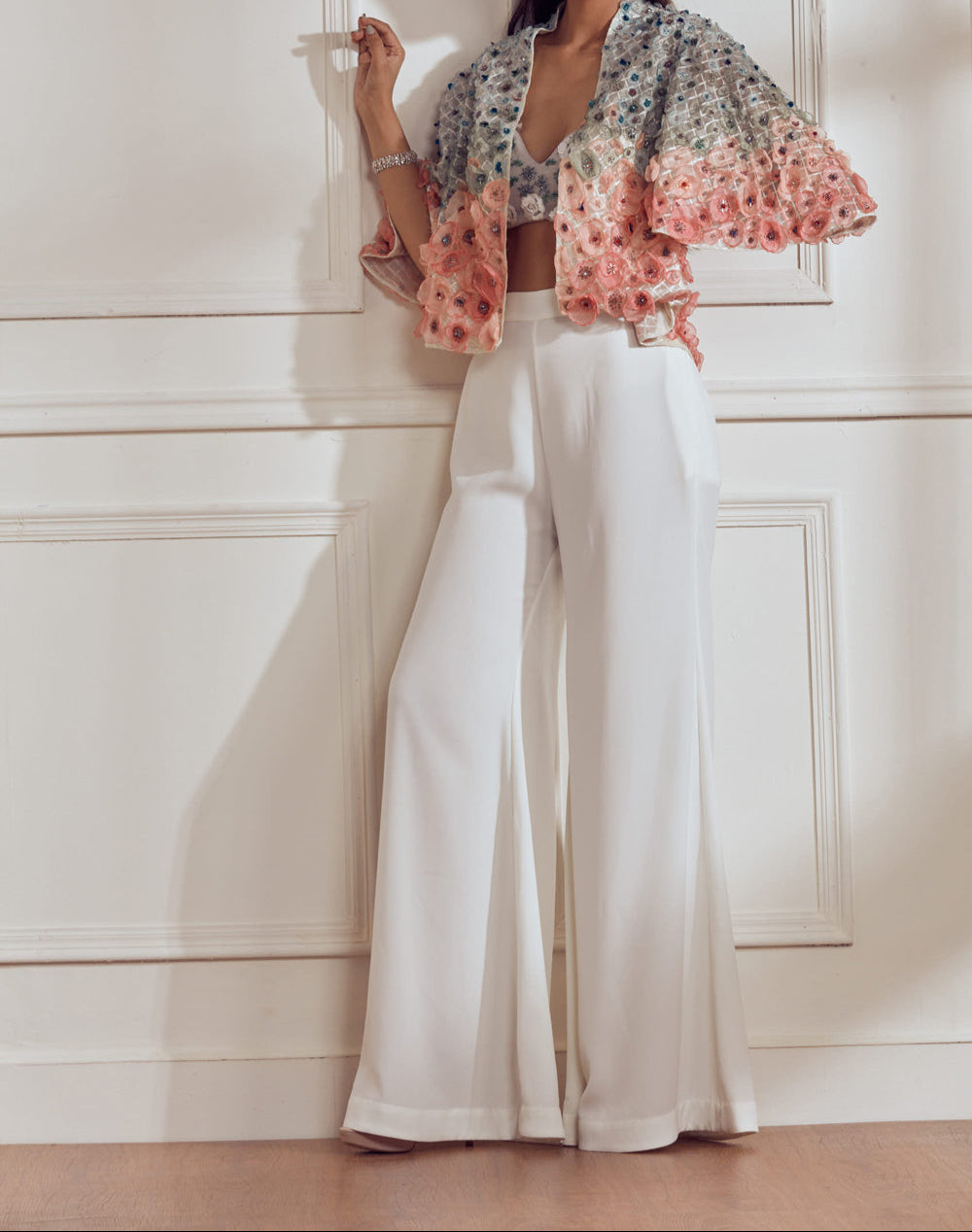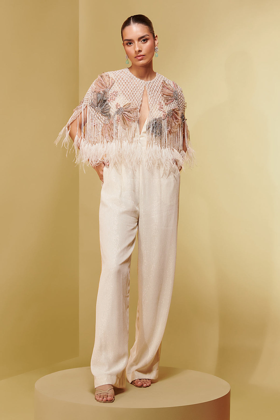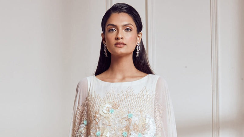 Embroidery Details:- White Sequin, White & Silver Bugle Beads, Gold Rhinestone, Laser Cut Applique Hand Work, Pearl Beads, Metallic Yarn