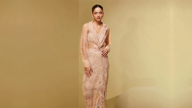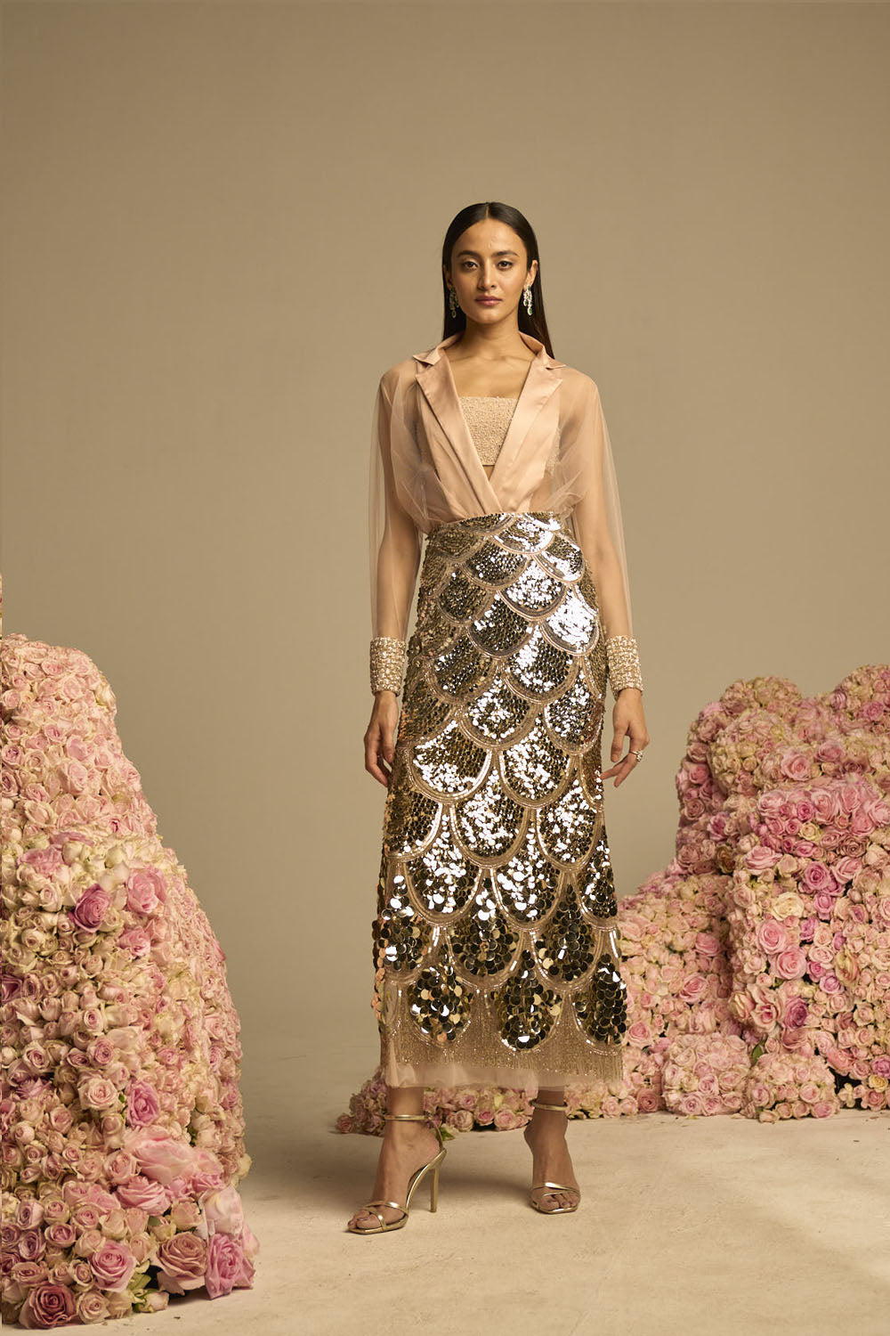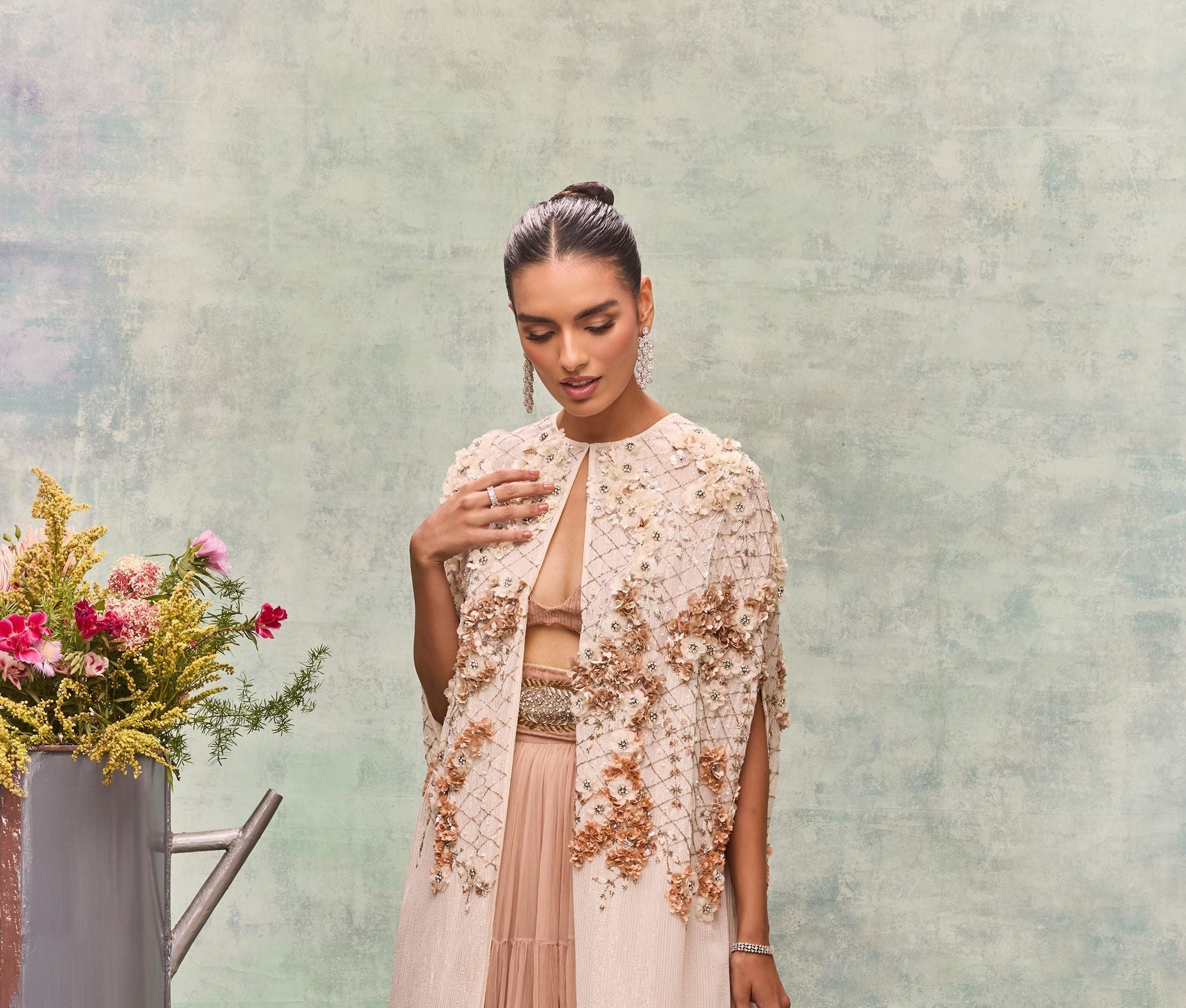 Product Description:- Willow dress with hand applique organza flowers adorned with sequin, bugle beads, metallic yarn & silver laser cut hand work, comes with attached sequin georgette short lining inside.